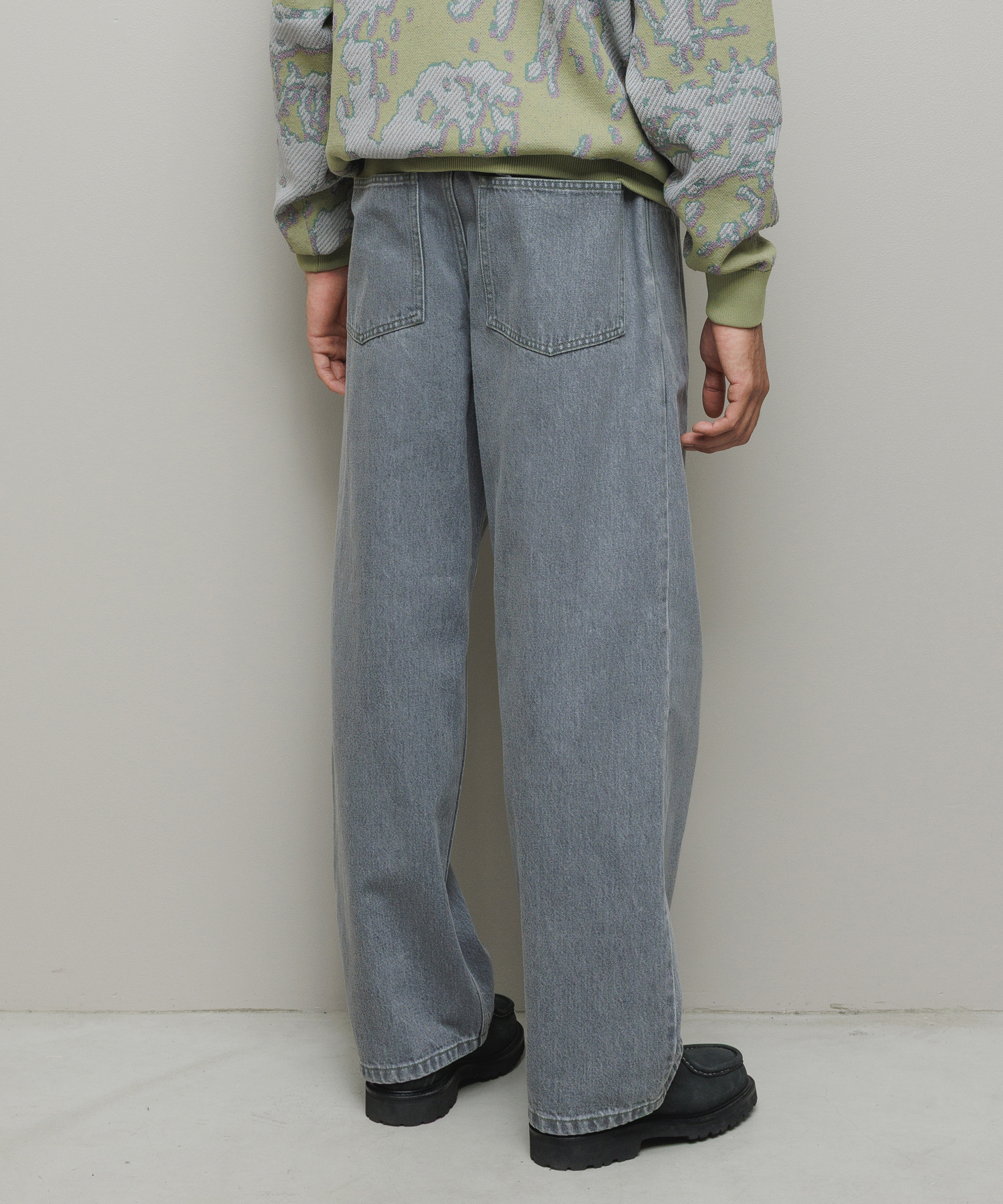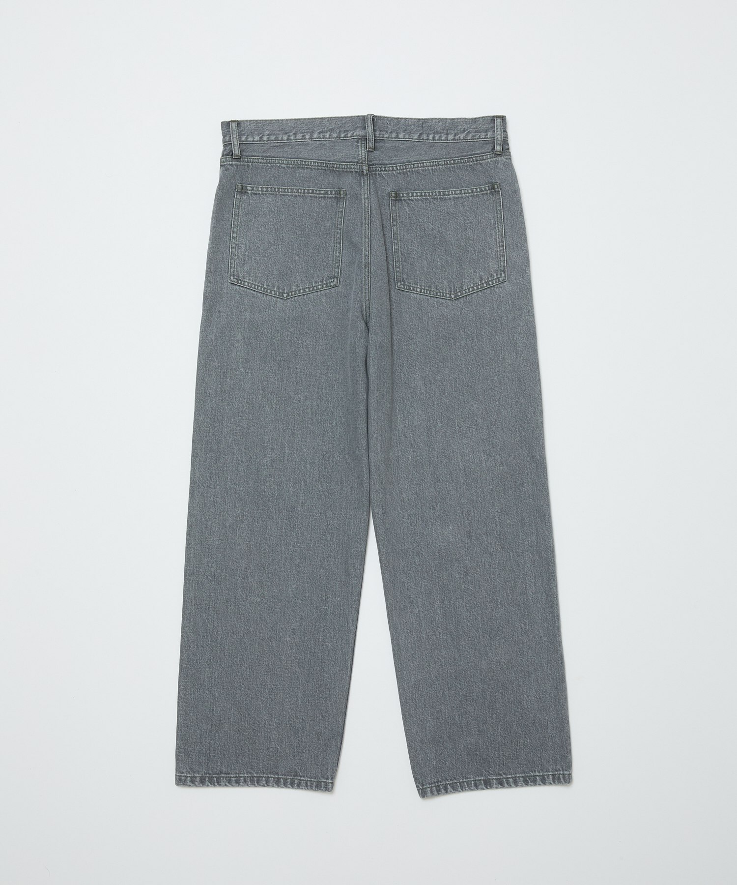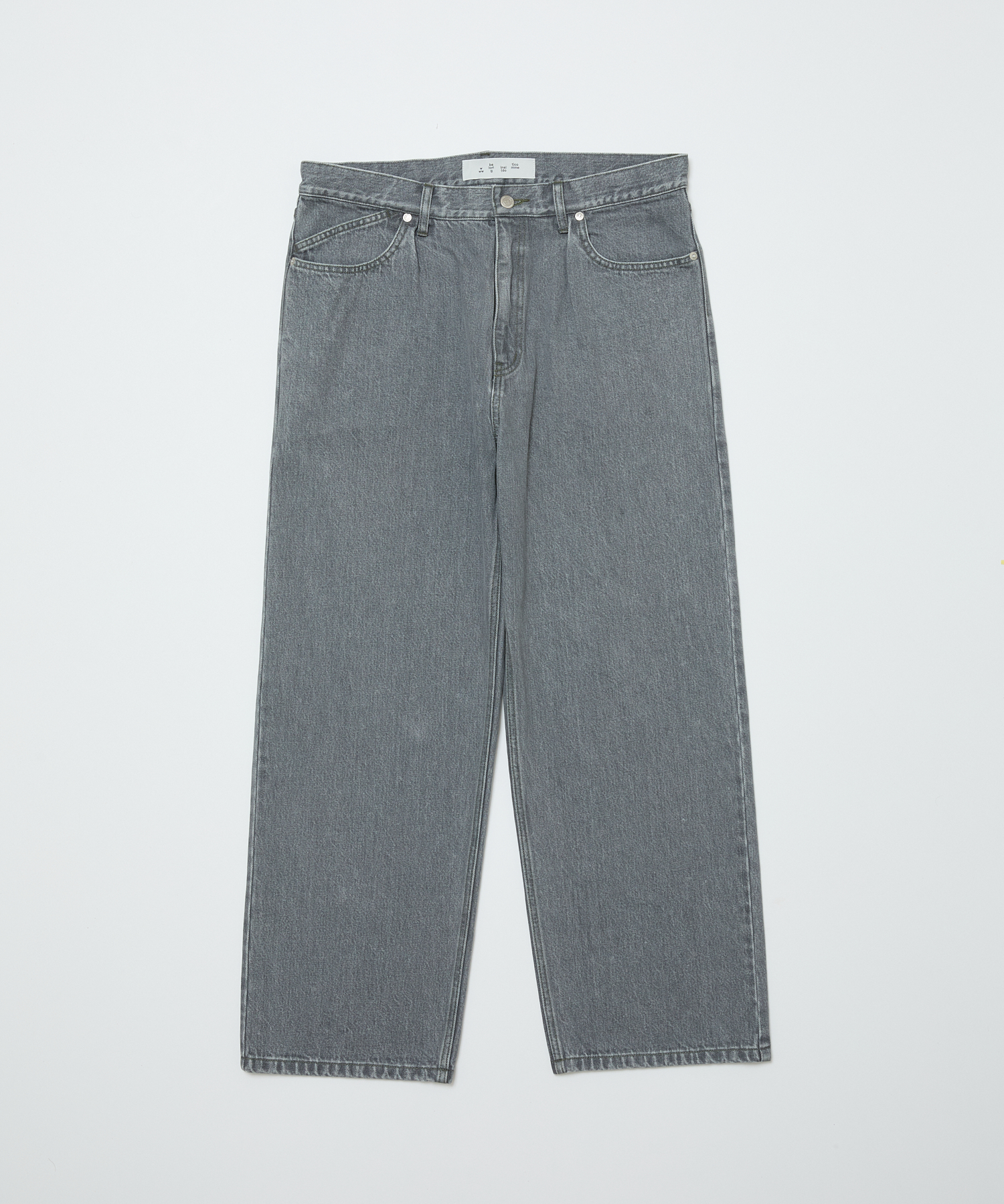 ストレートレッグのワイドシルエットの5ポケットジーンズ。タック入り、ダブルヨークデザイン。色落ち感のクリーンな12ozの岡山県産デニム。リジッド、ブラック、インディゴのミディアムウオッシュ広島県福山にて作成。MADE IN JAPAN。