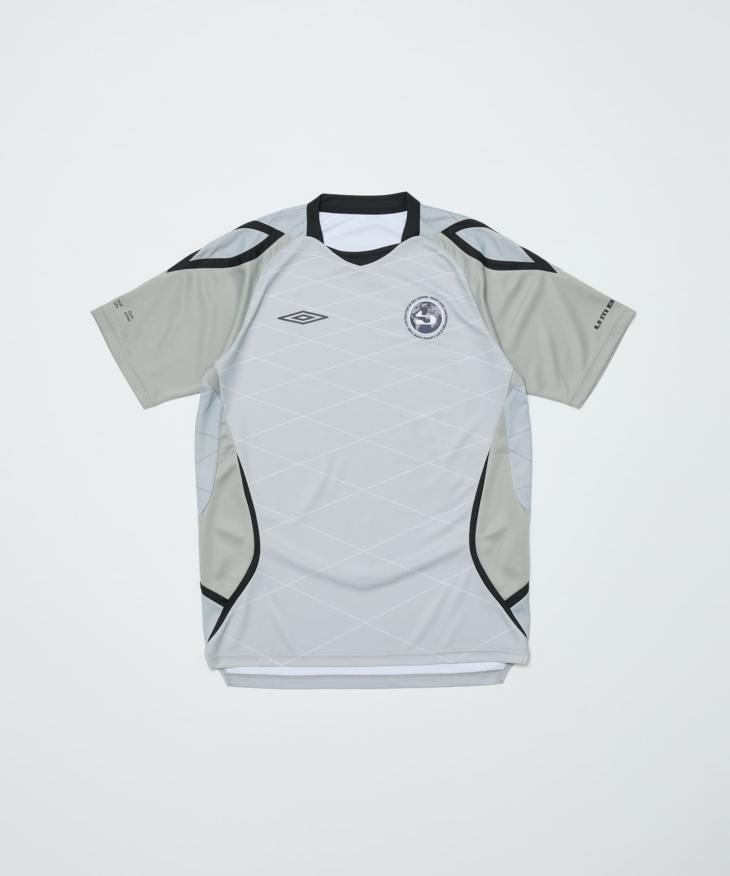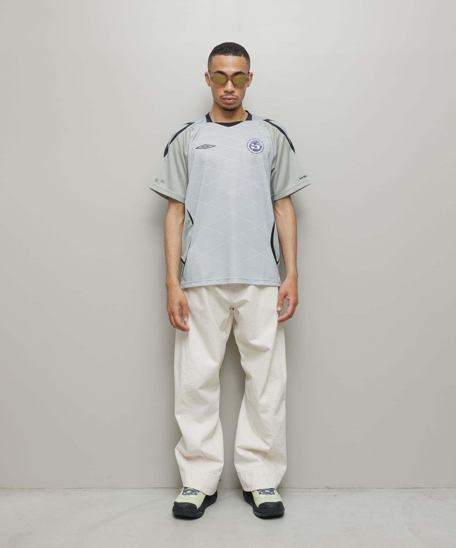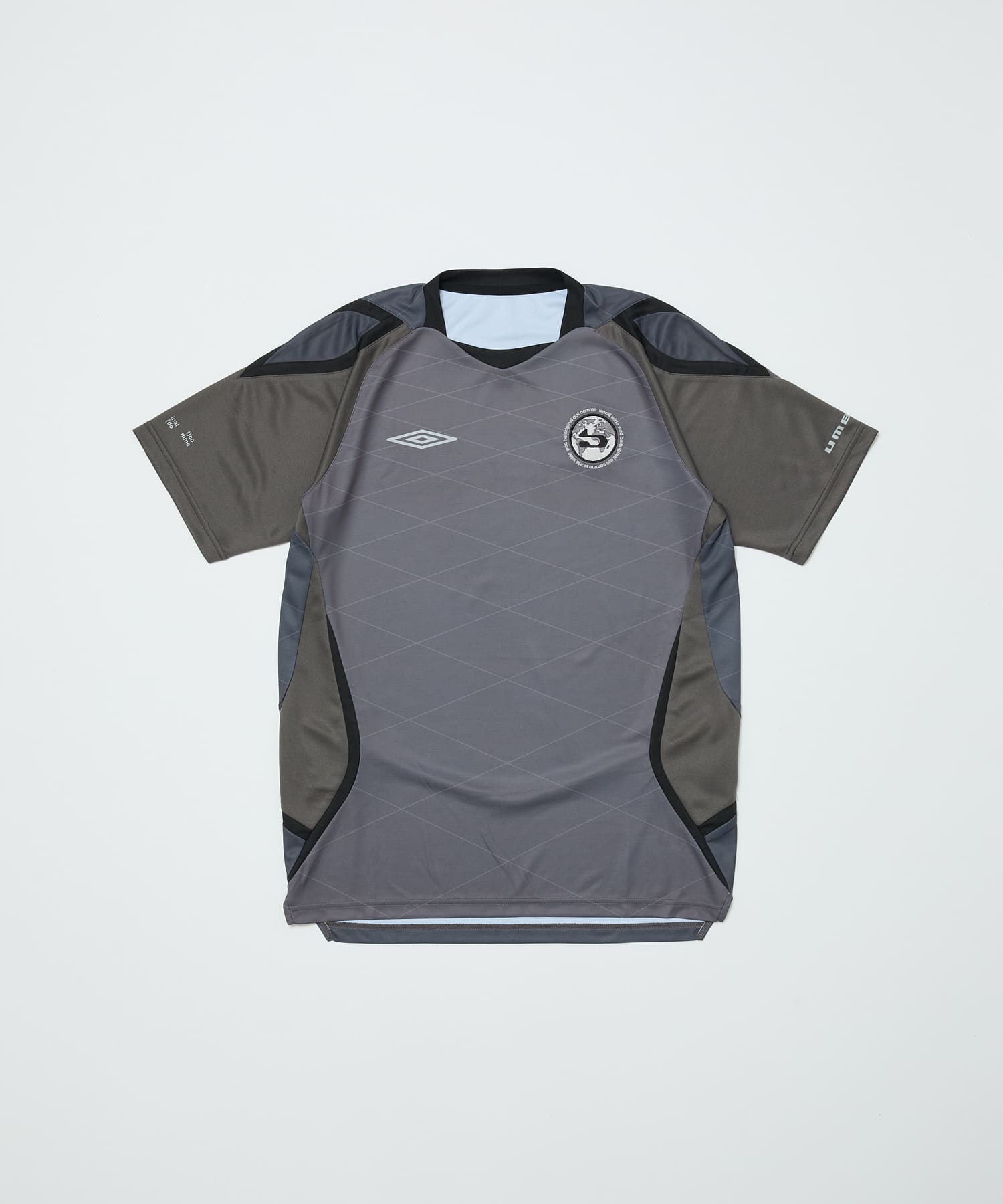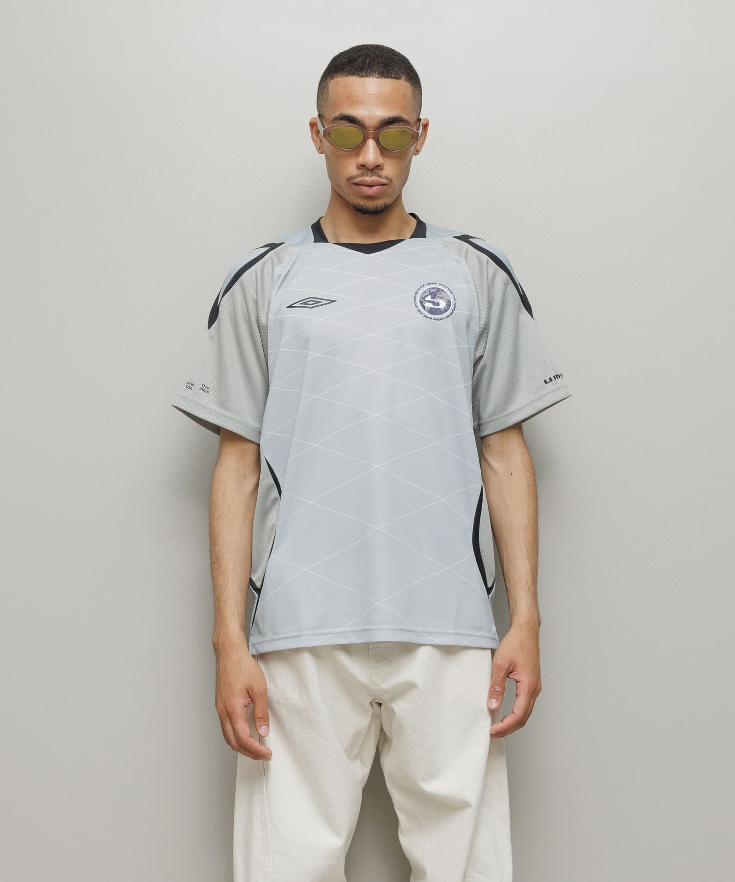 英国初老舗スポーツブランド〈UMBRO〉とのコラボレーションのサッカージャージ。ショートスリーブ。オリジナルグラフィックプリントテキスタイルとナンバリングプリント。吸水速乾機能のポリエステル素材。