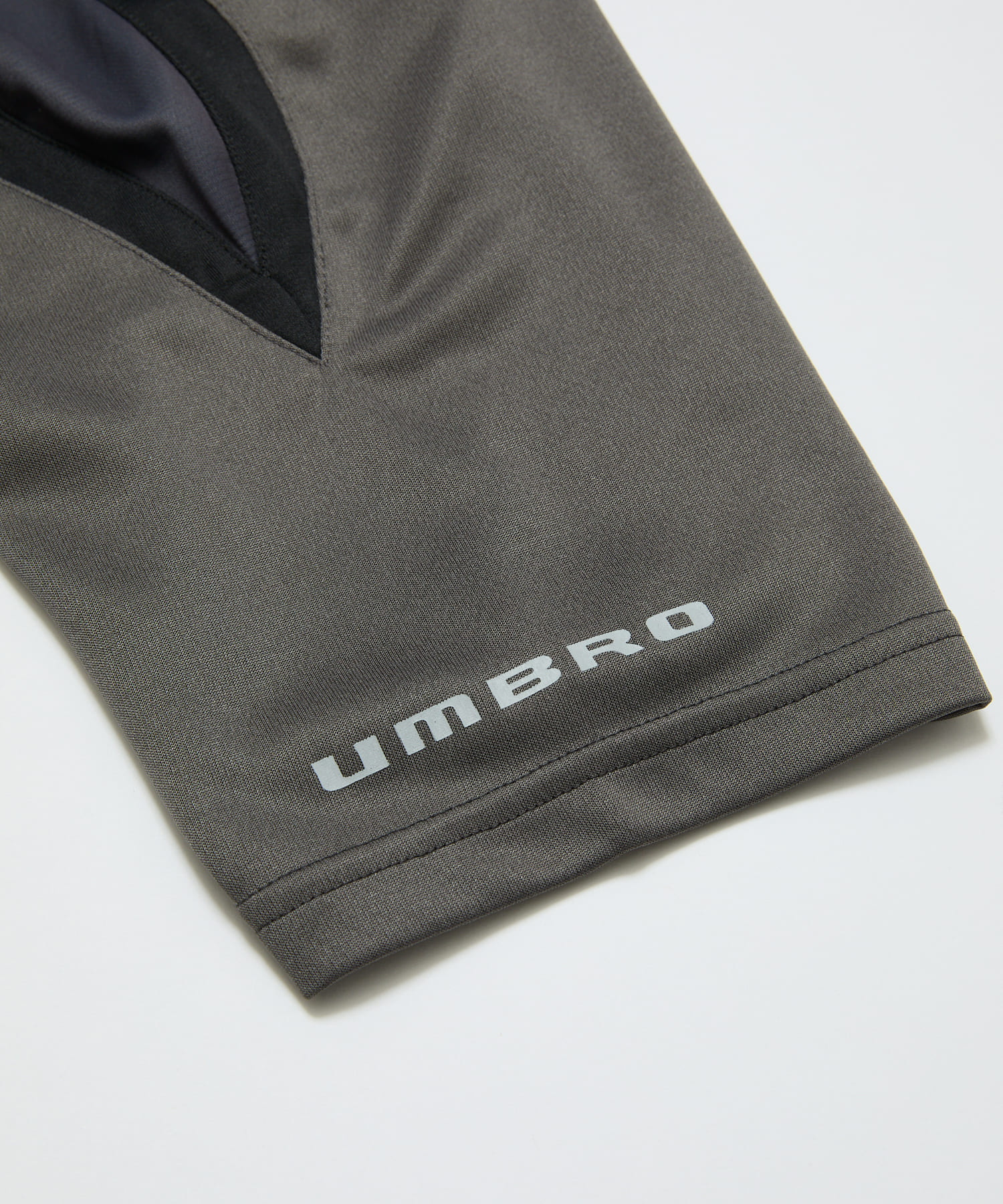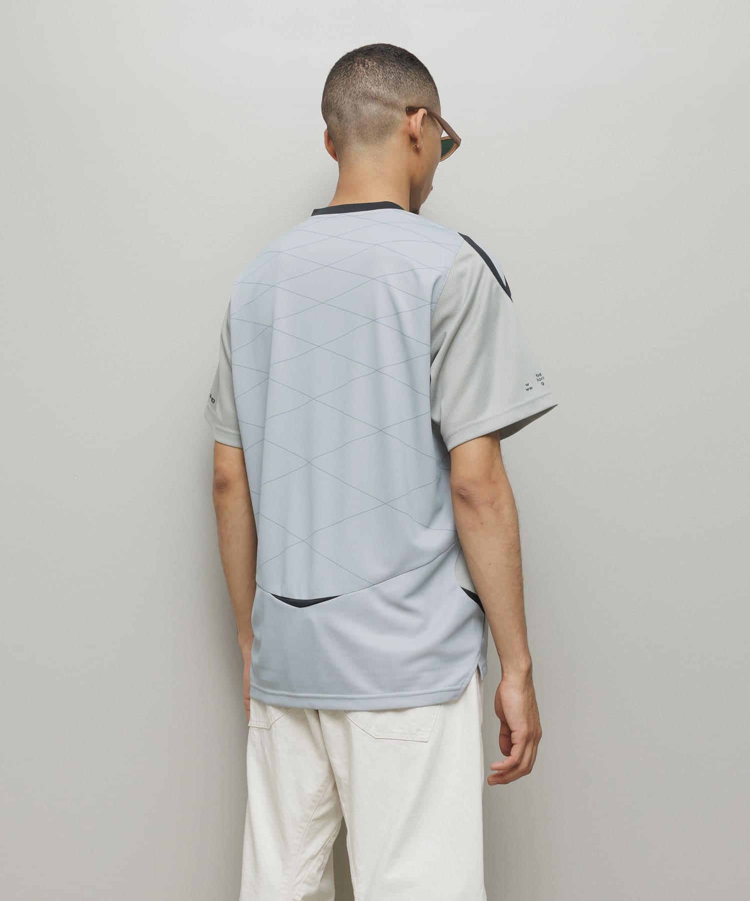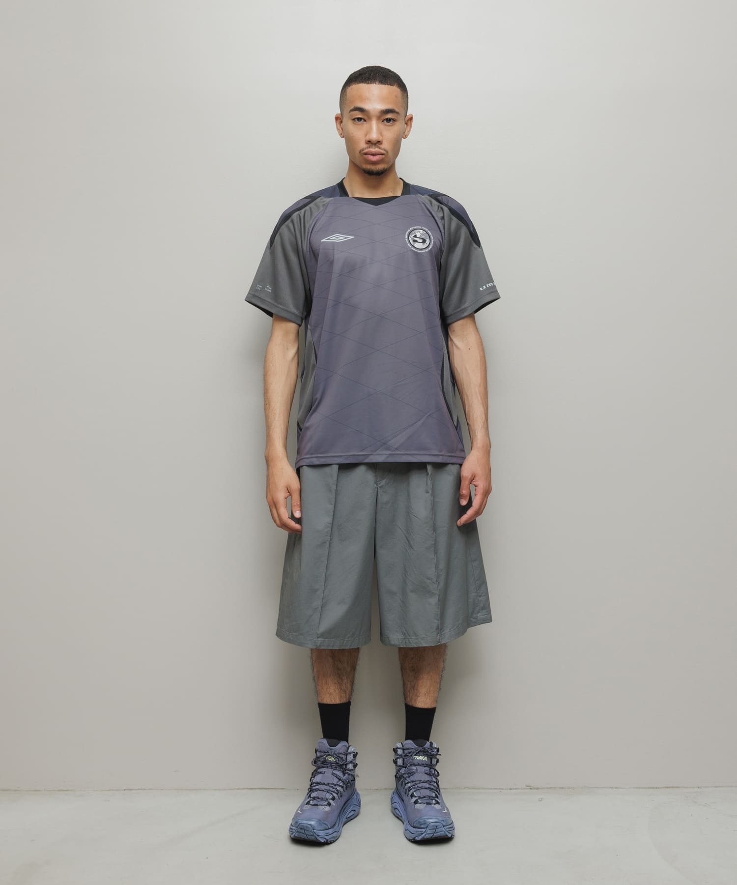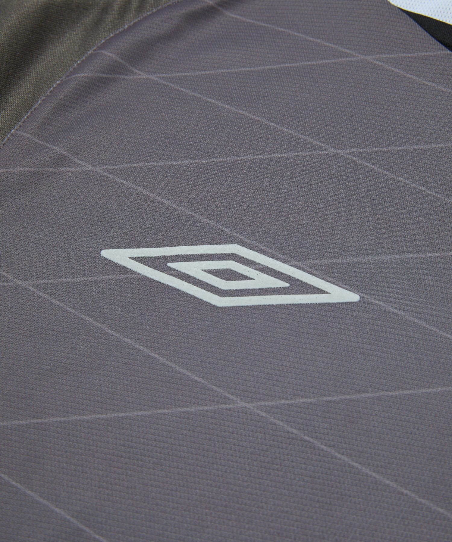 英国初老舗スポーツブランド〈UMBRO〉とのコラボレーションのサッカージャージ。ショートスリーブ。オリジナルグラフィックプリントテキスタイルとナンバリングプリント。吸水速乾機能のポリエステル素材。