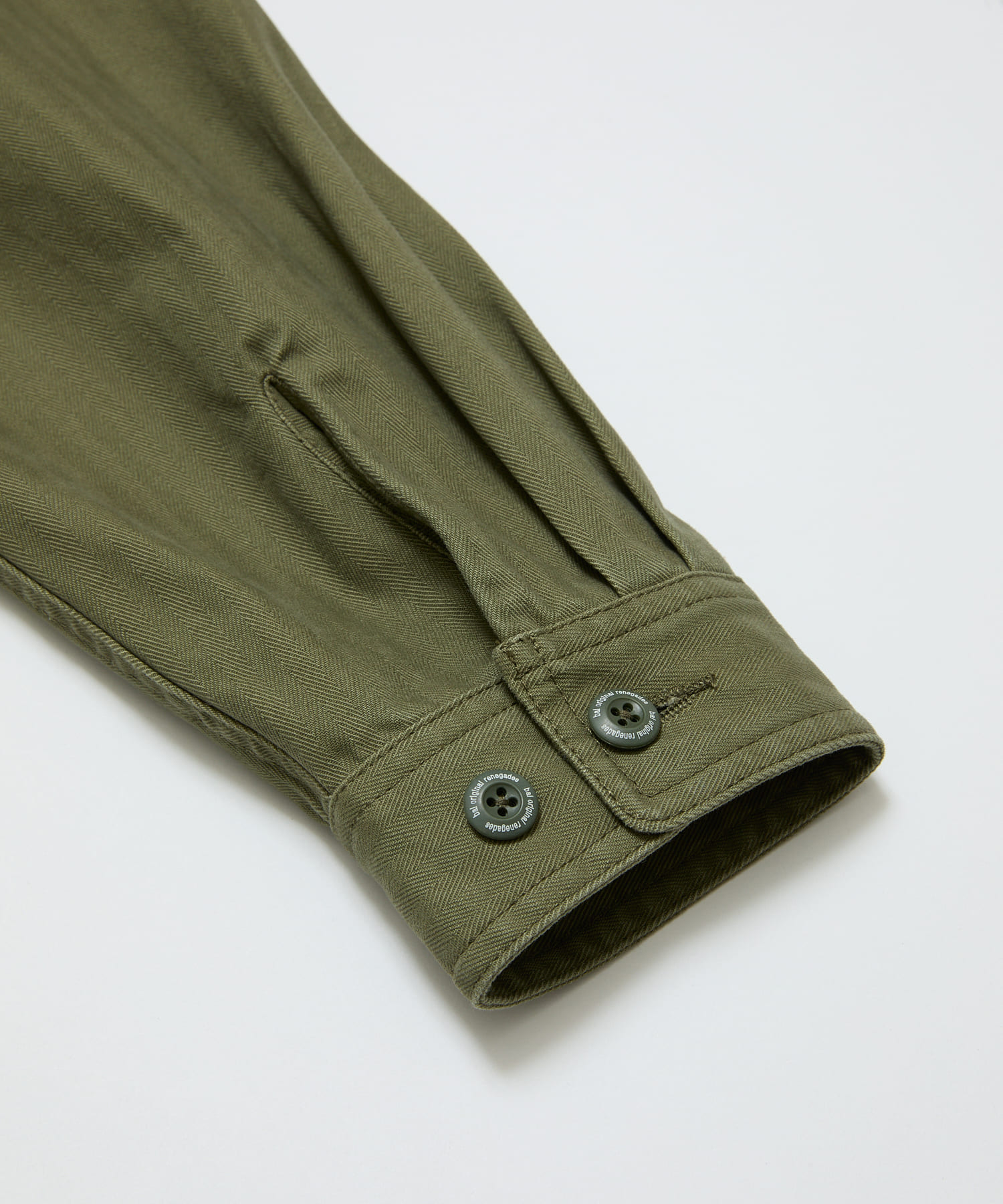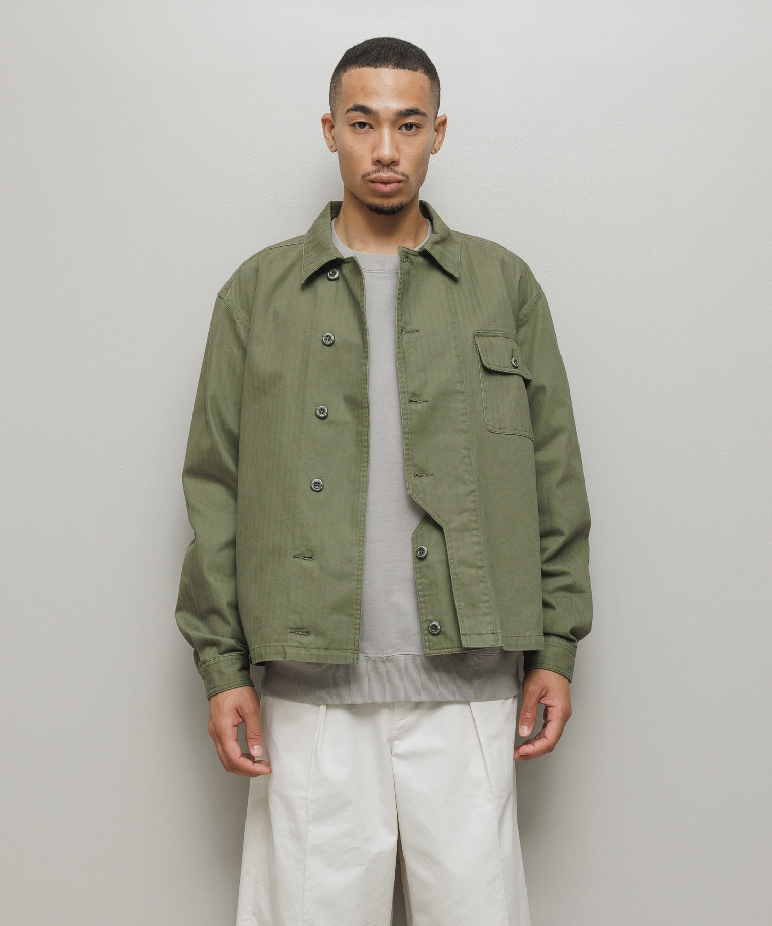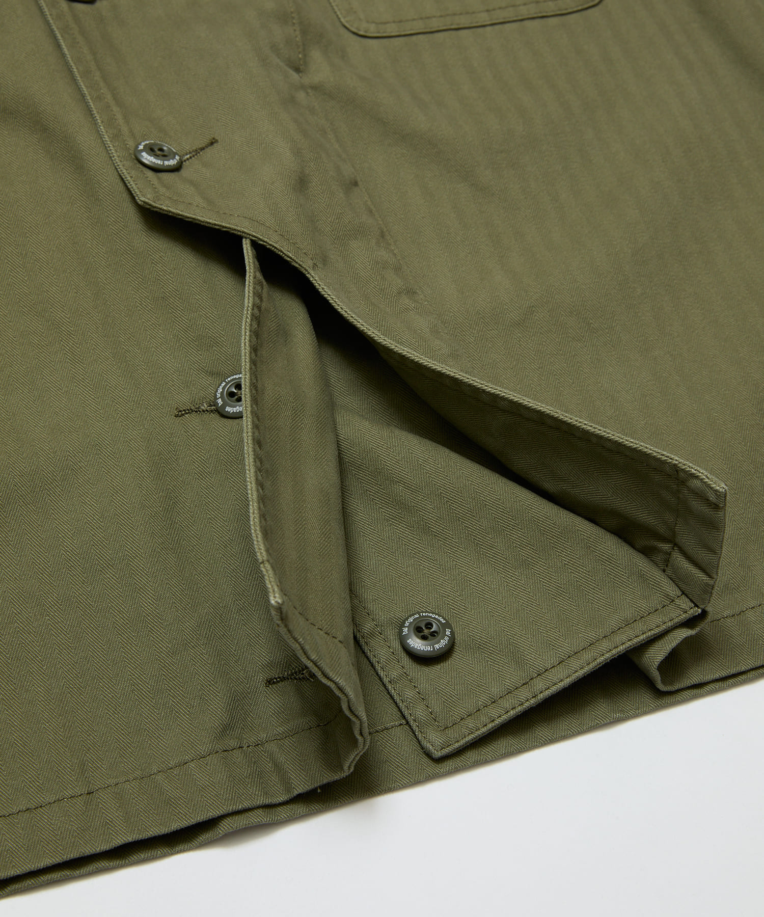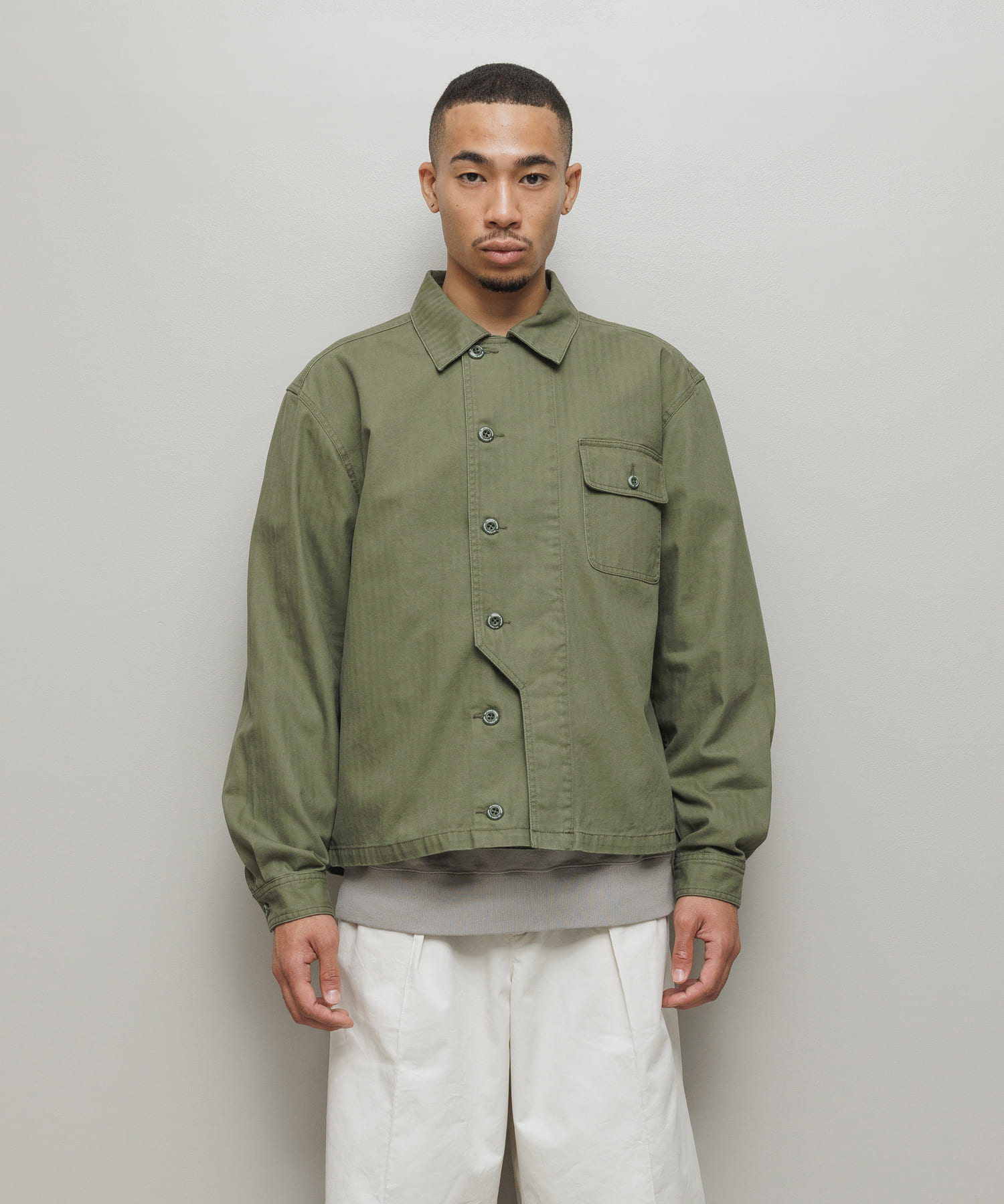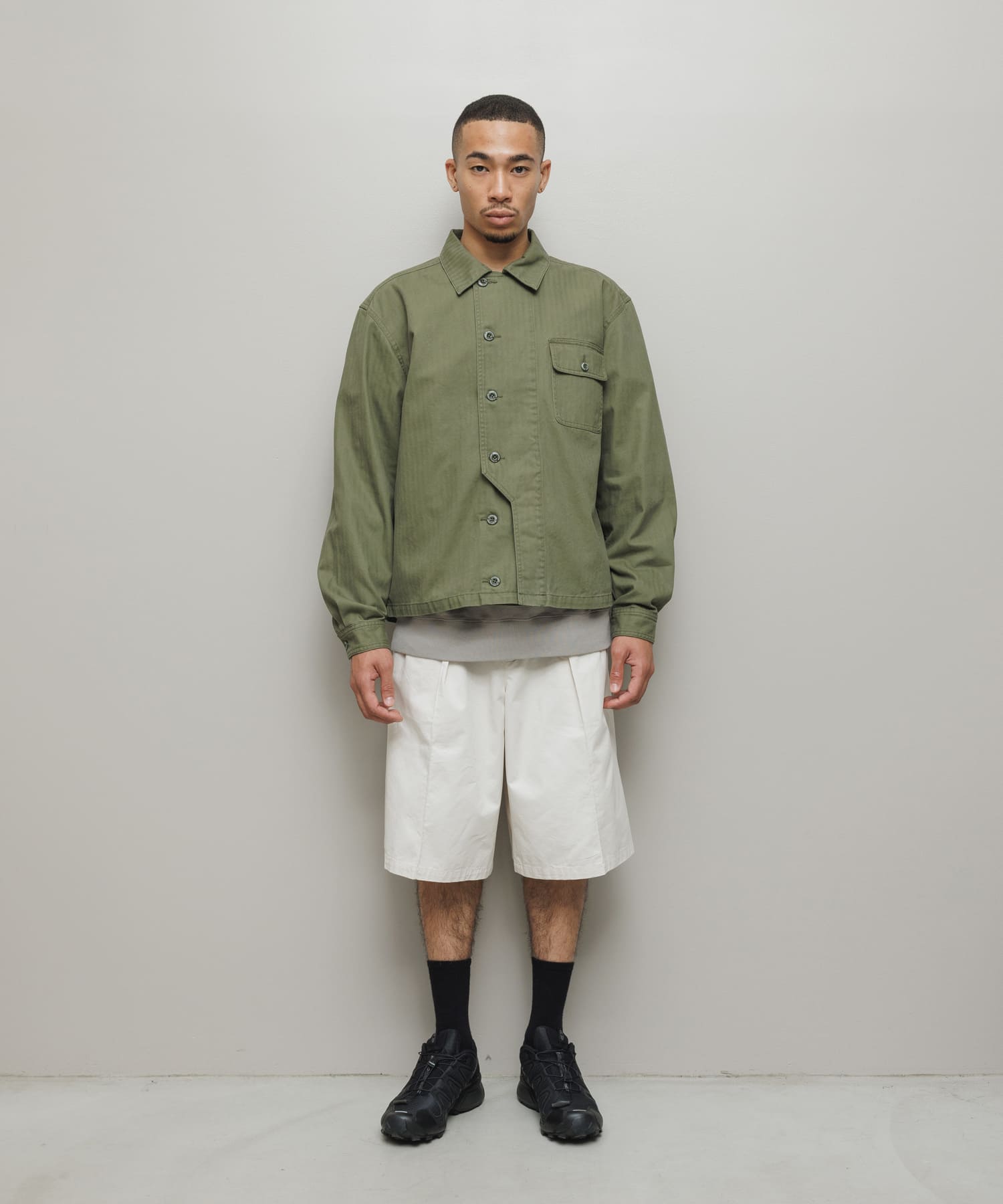 斜めにカットされたフロント。オリジナルミリタリーボタン・バイオウオッシュ加工。