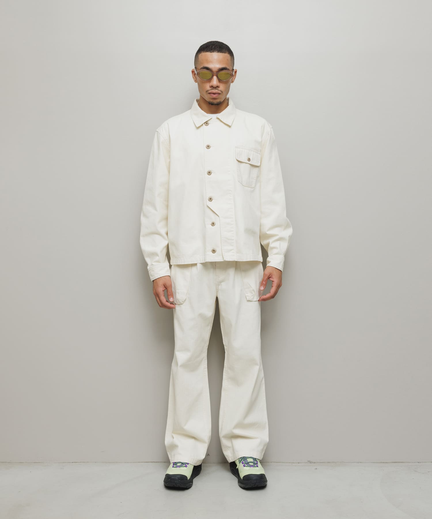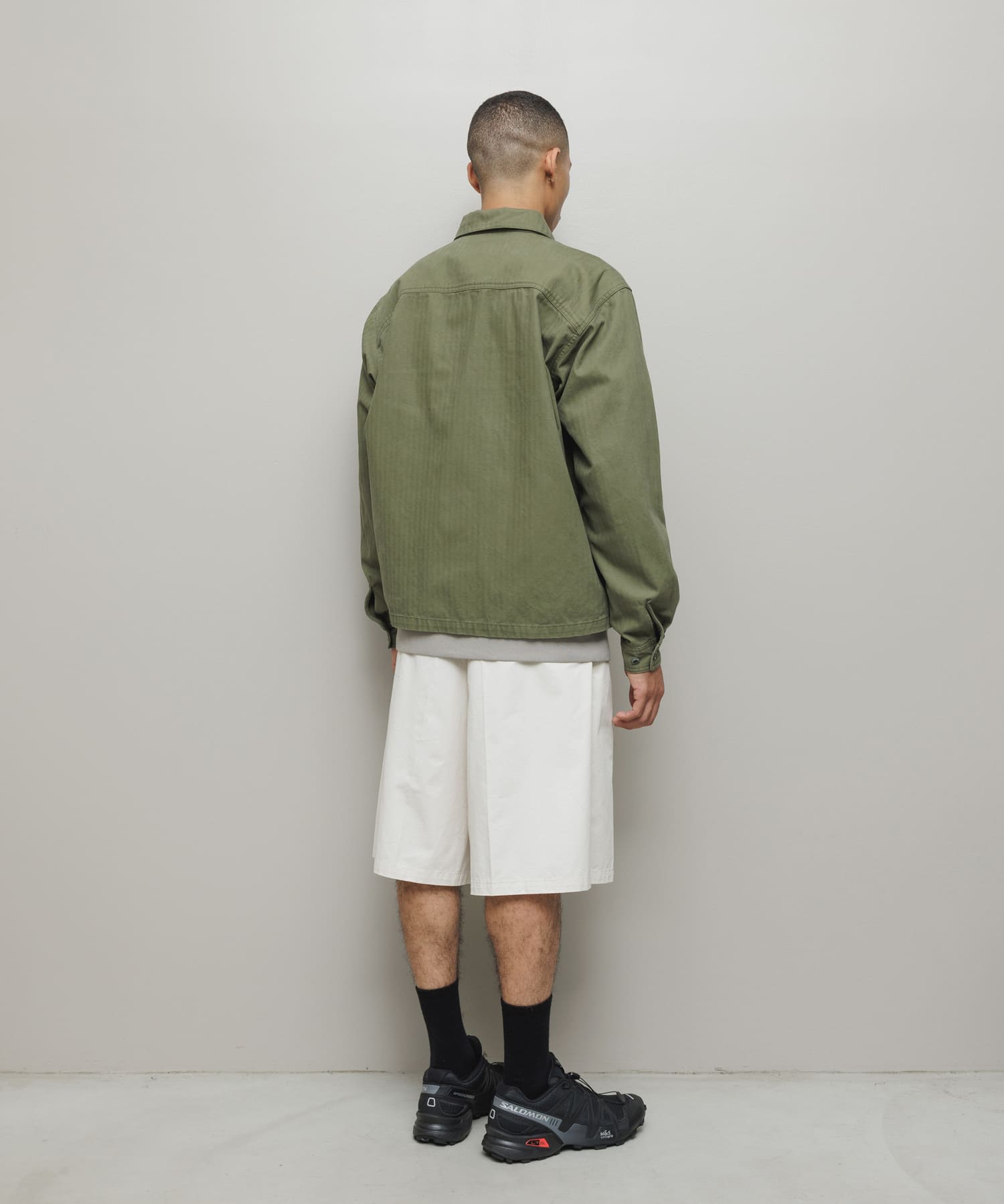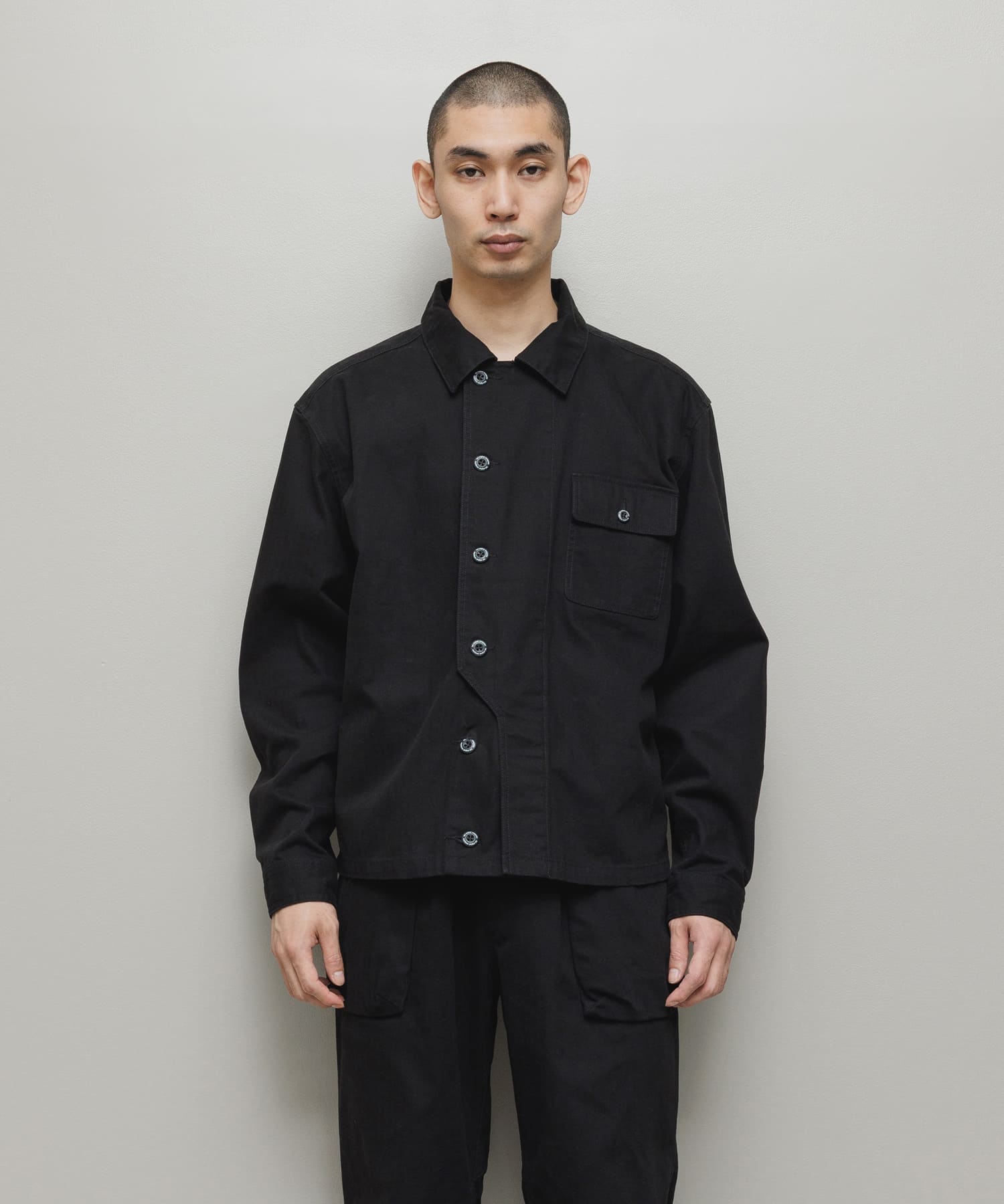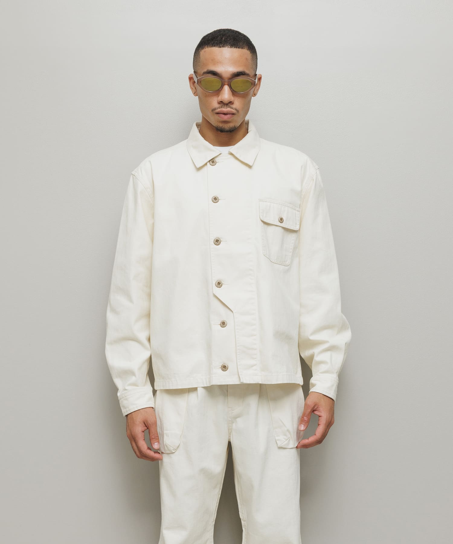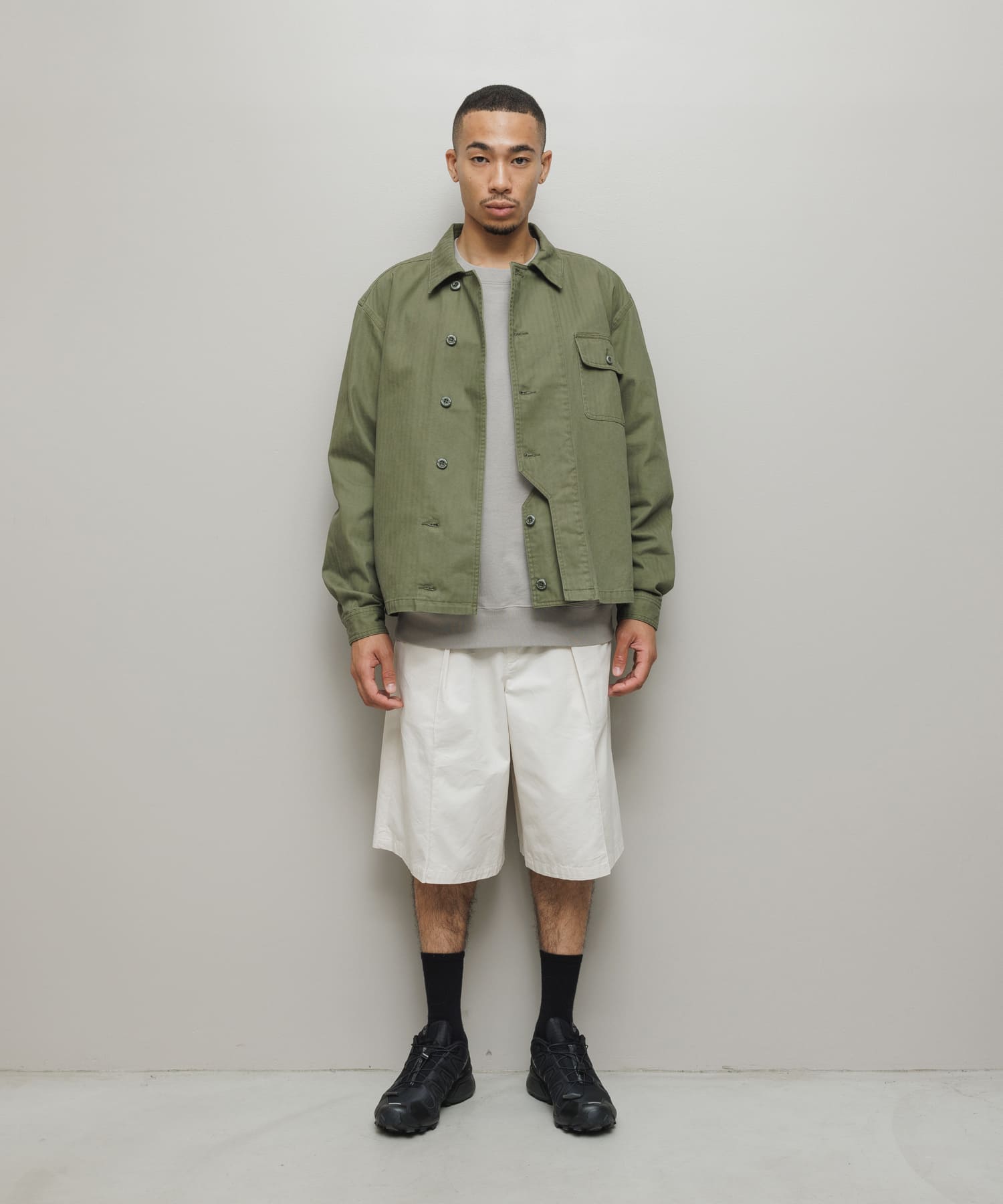 斜めにカットされたフロント。オリジナルミリタリーボタン・バイオウオッシュ加工。
