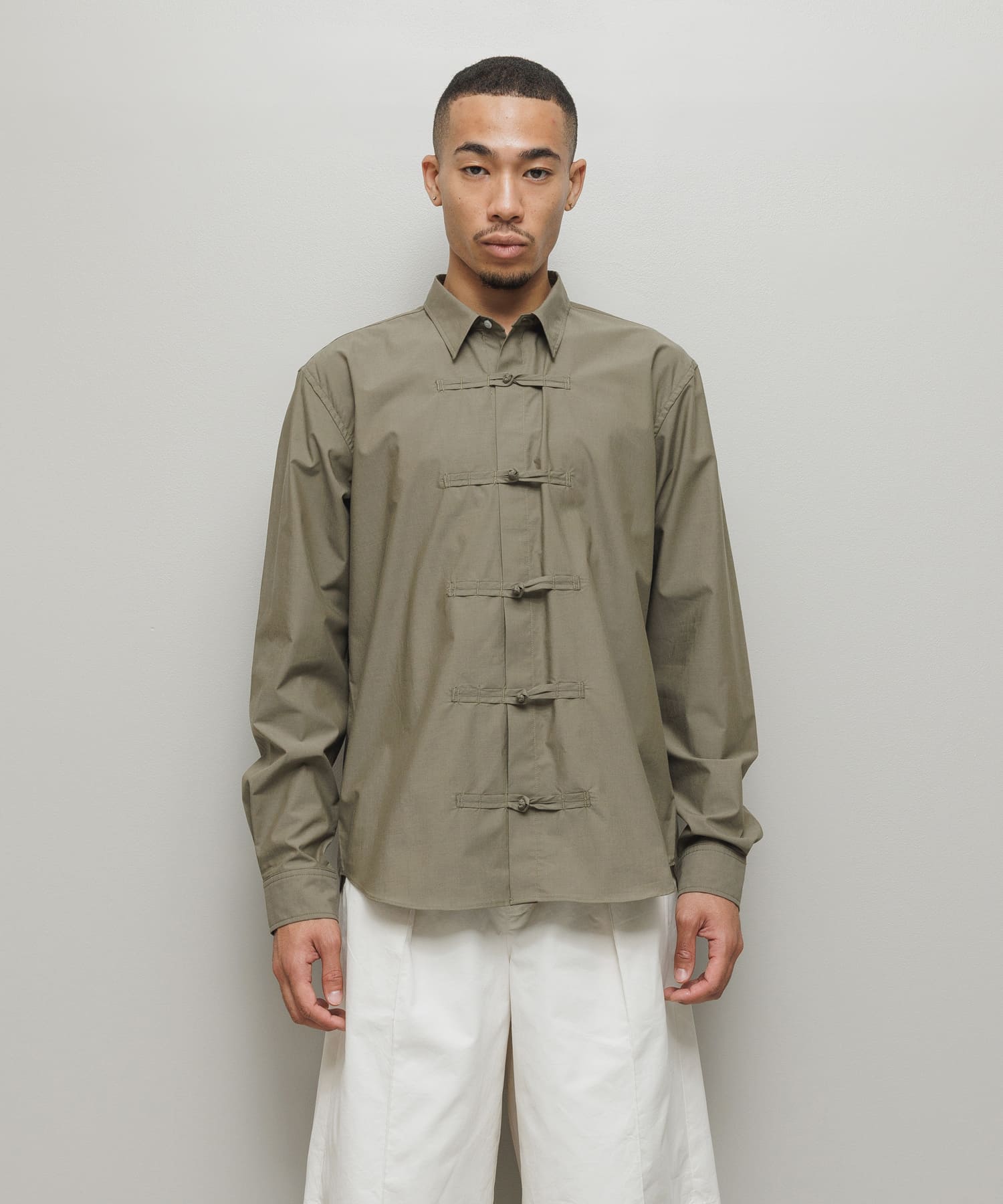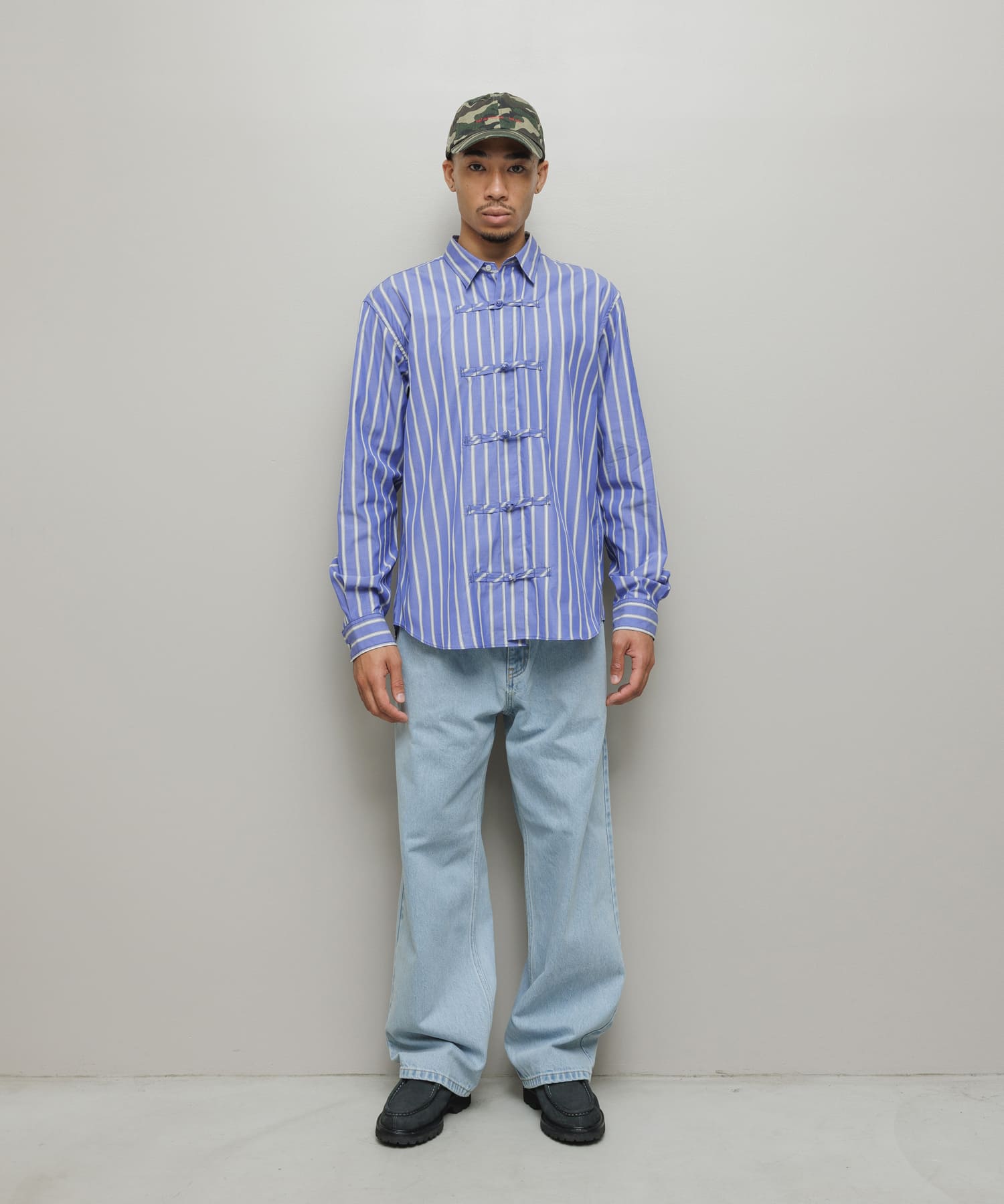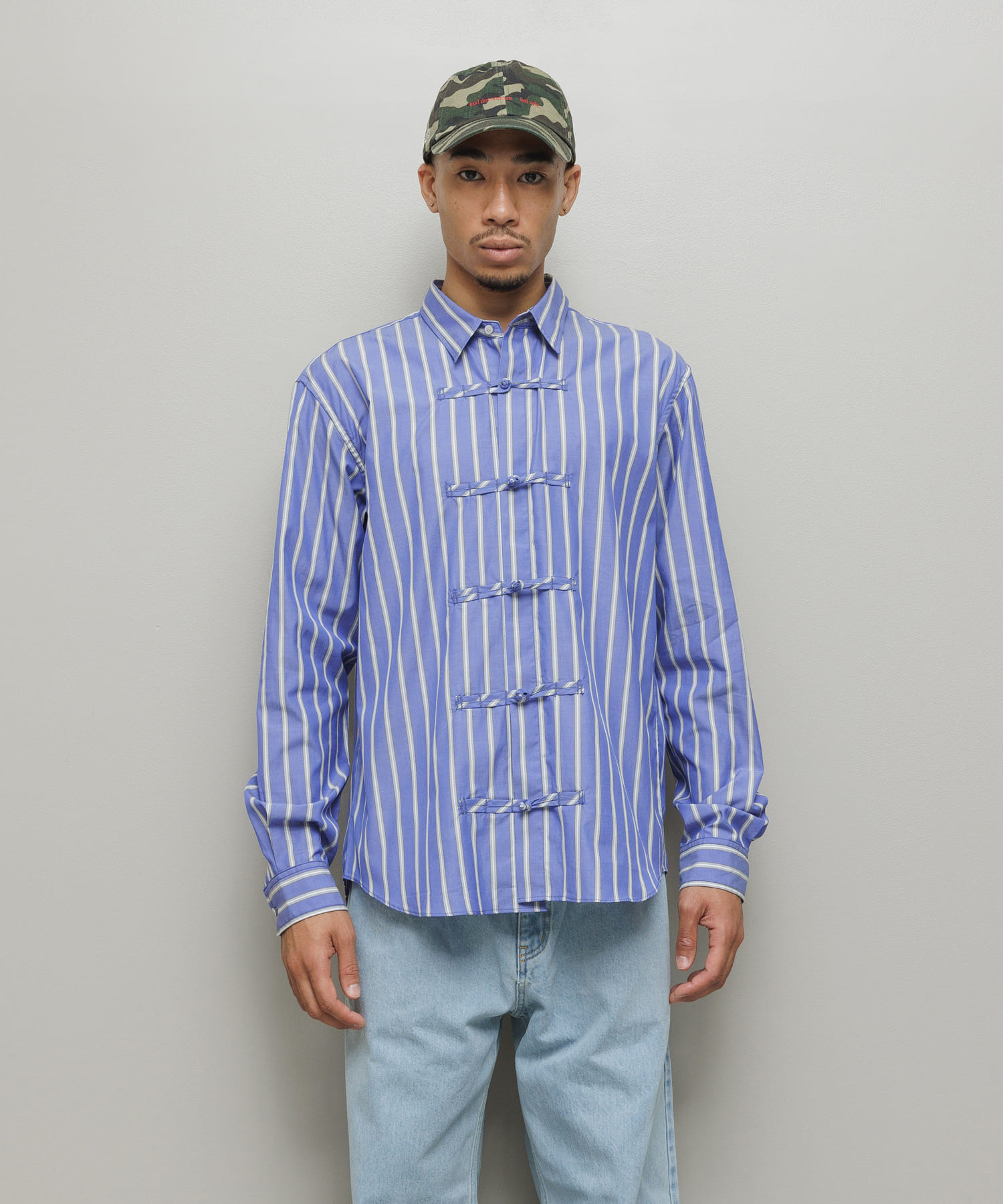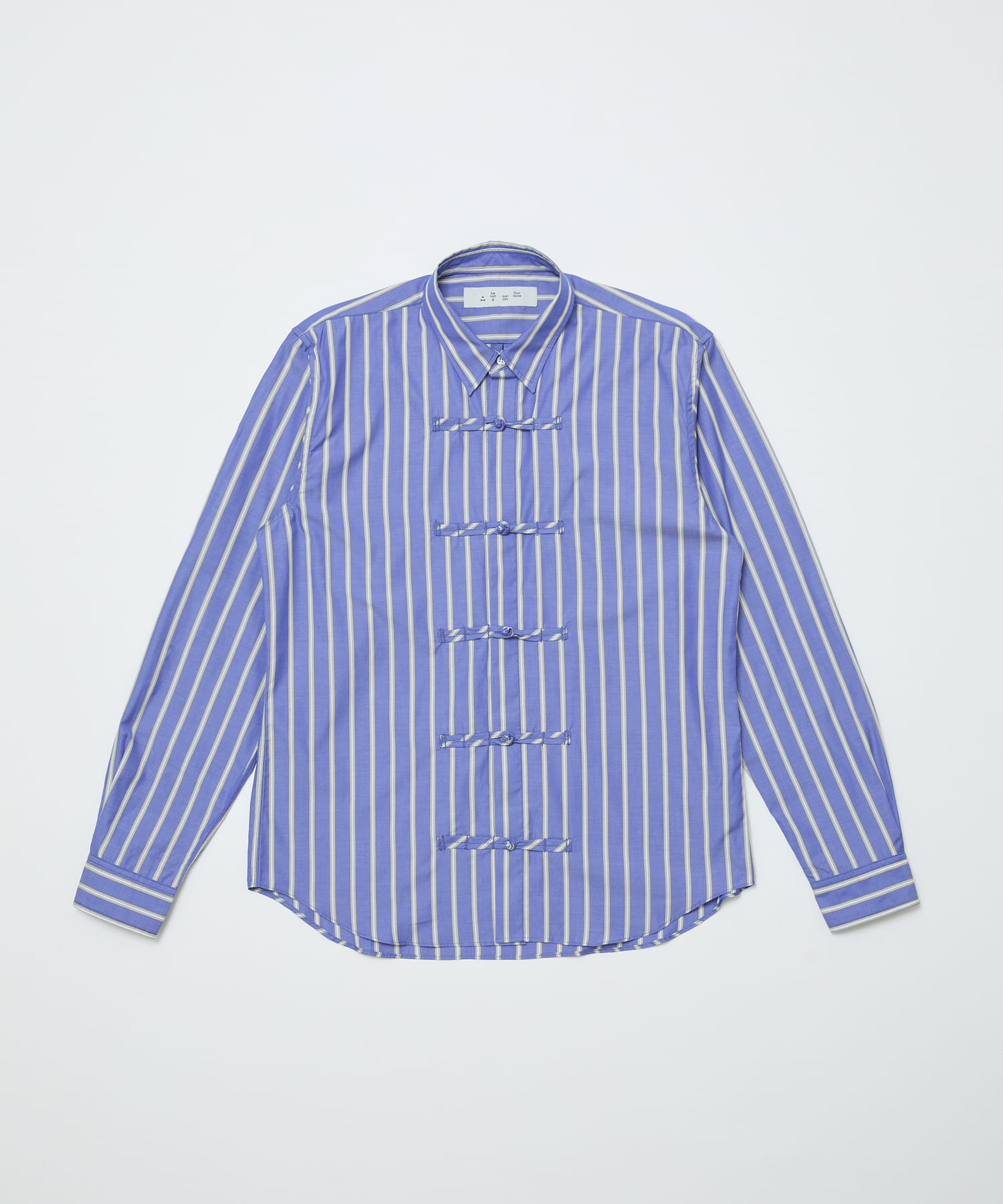 使用する生地で作成した組紐フロッグボタンフロントのストライプシャツ。