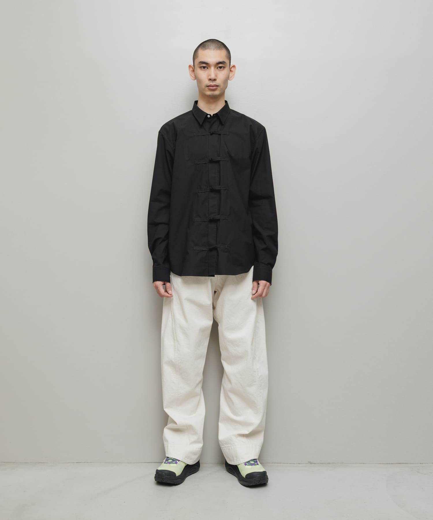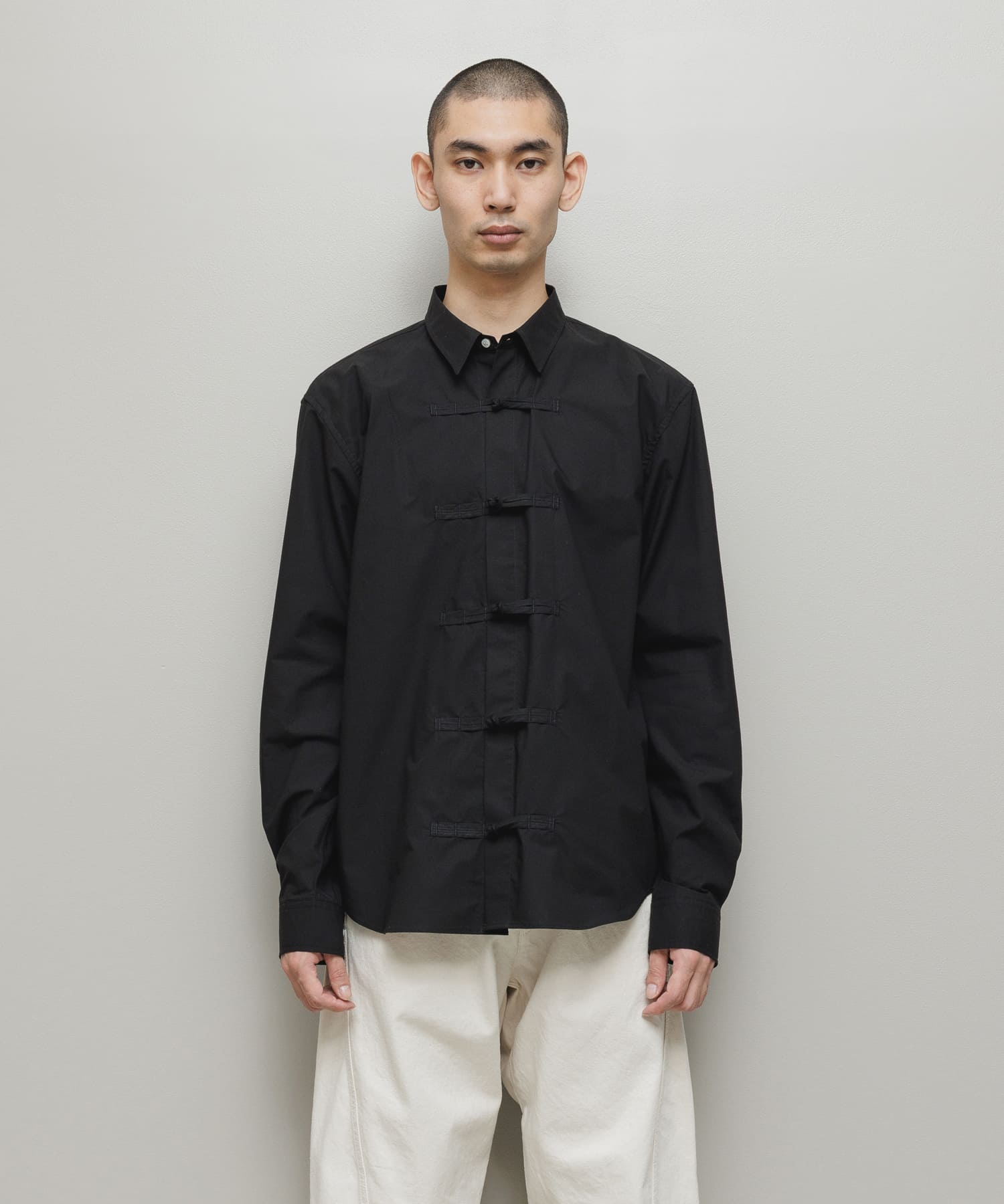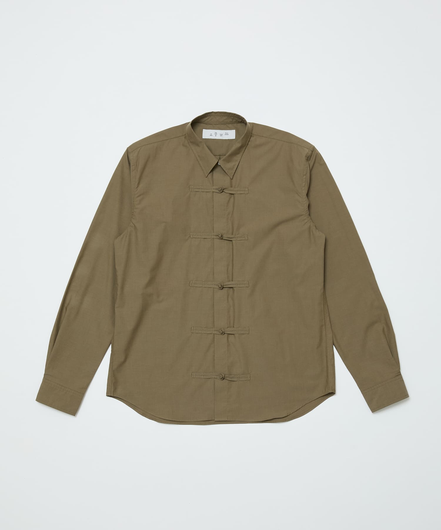 使用する生地で作成した組紐フロッグボタンフロントのストライプシャツ。