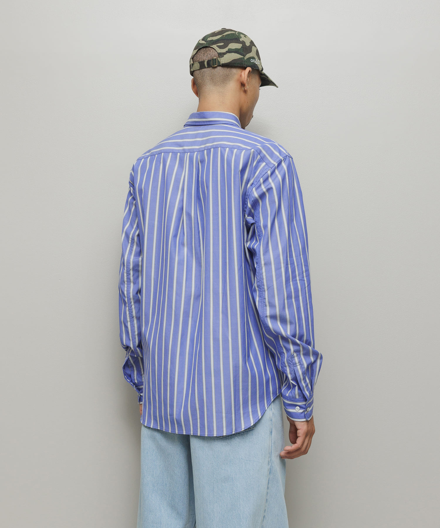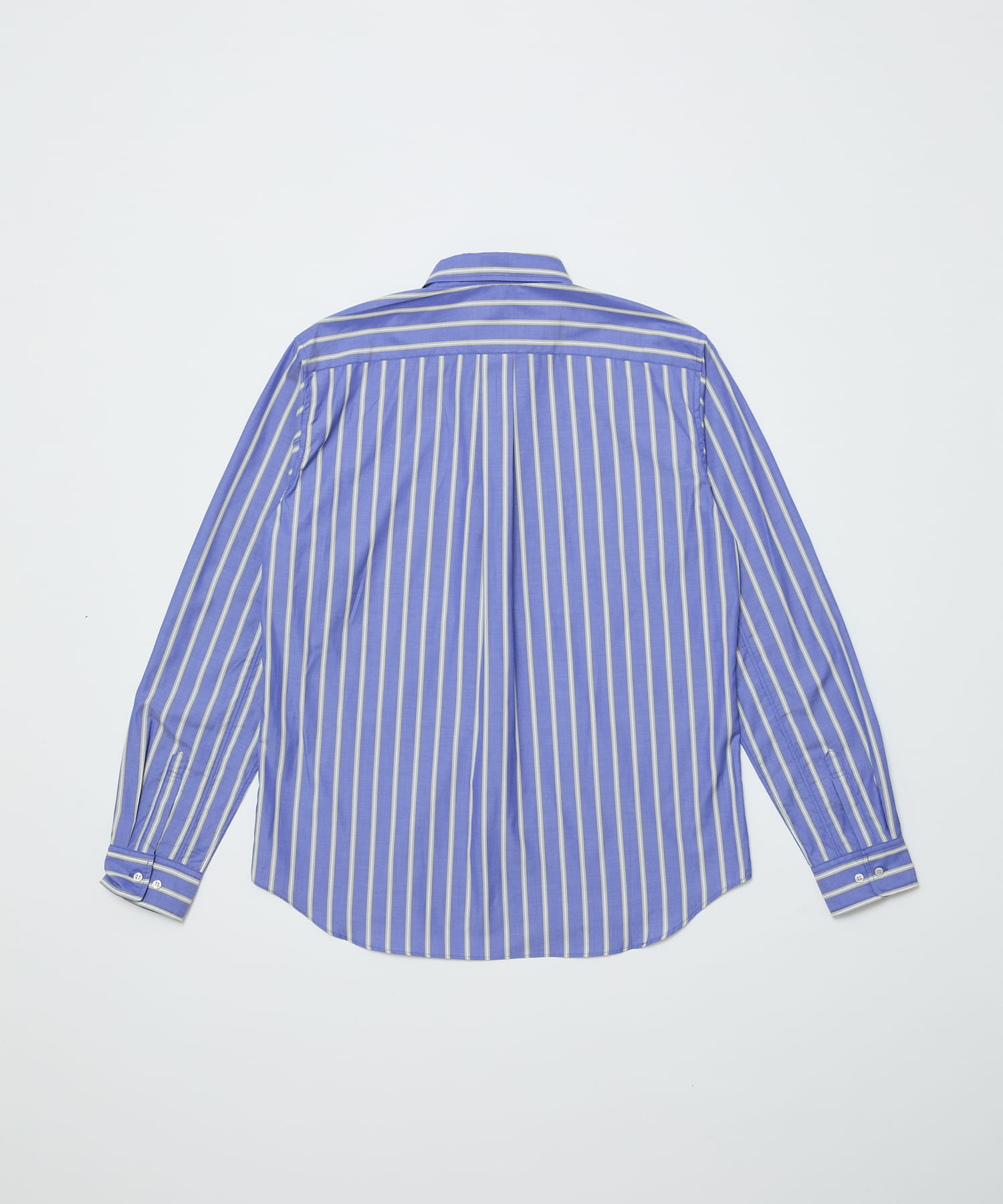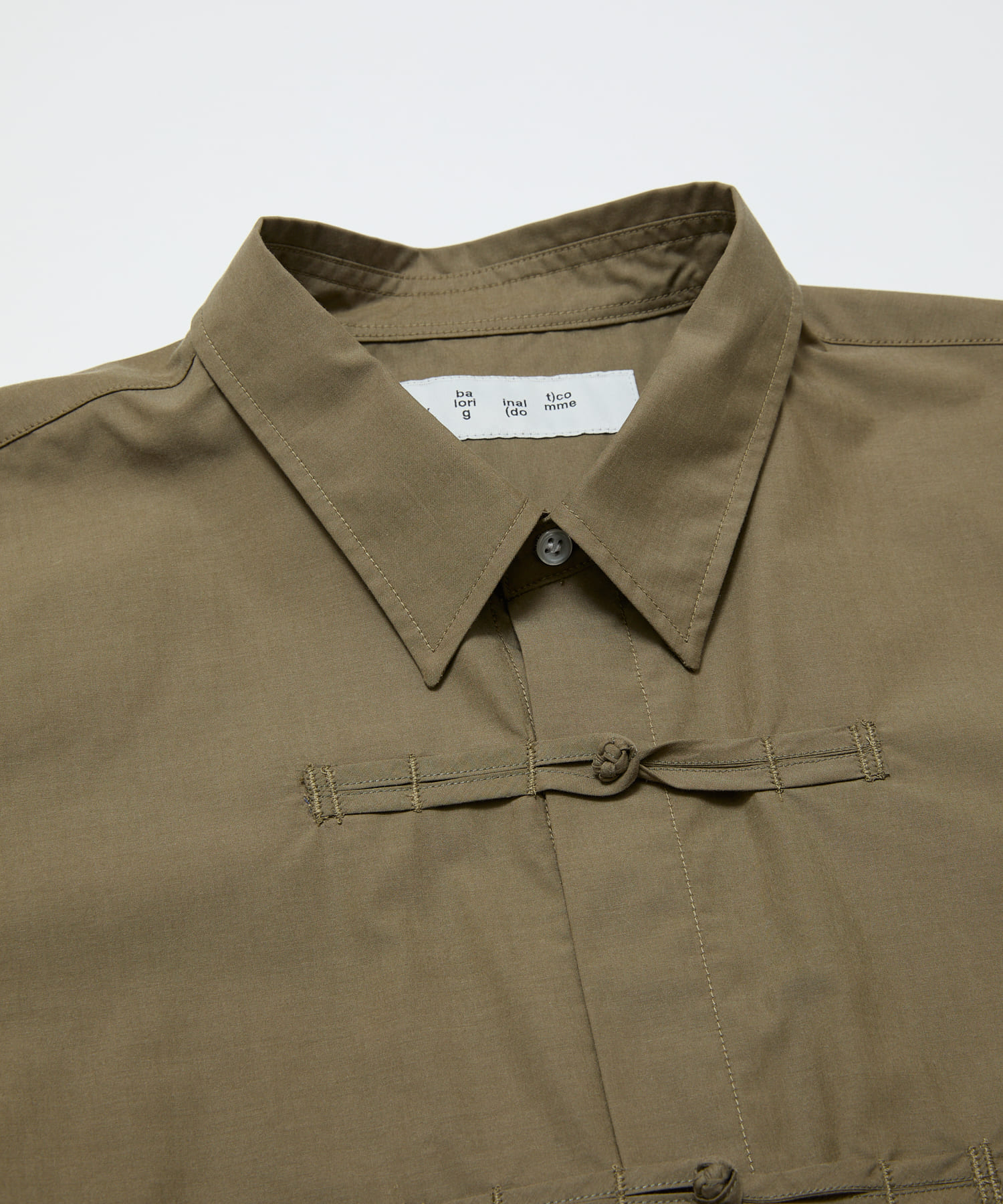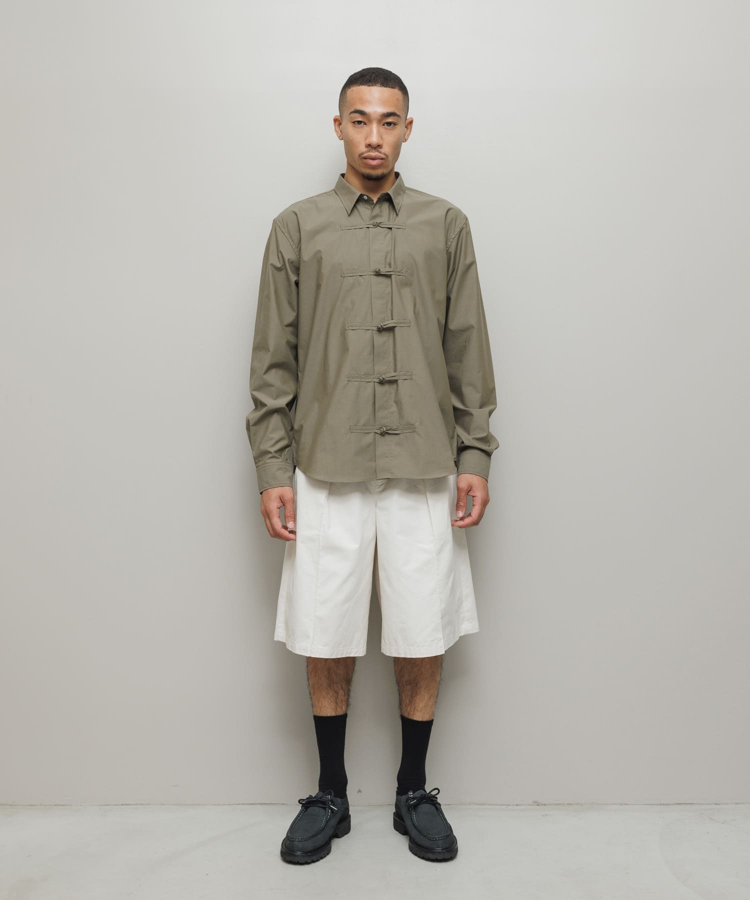 使用する生地で作成した組紐フロッグボタンフロントのストライプシャツ。