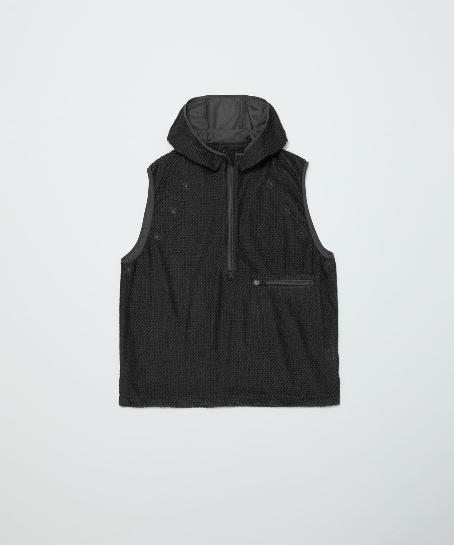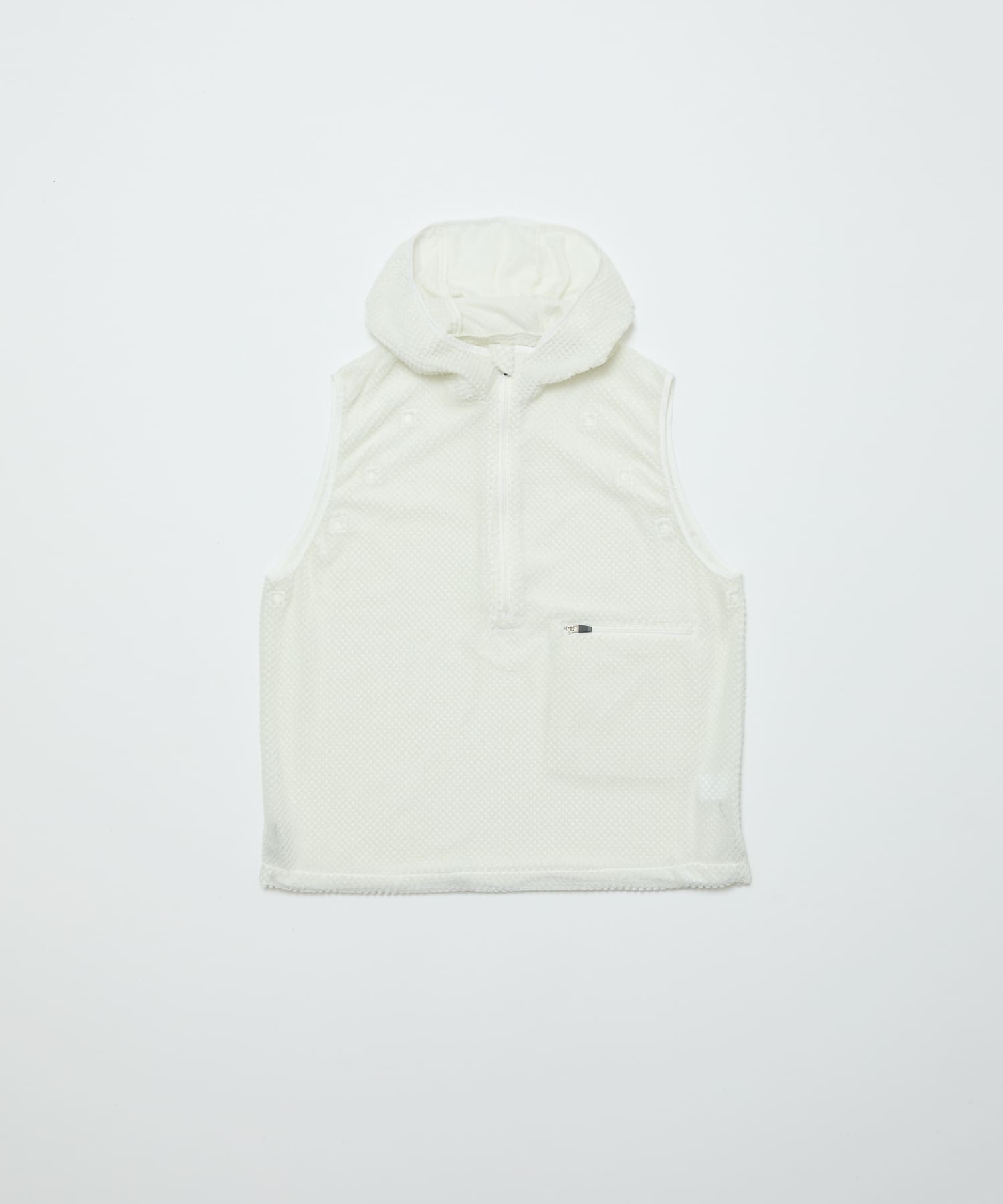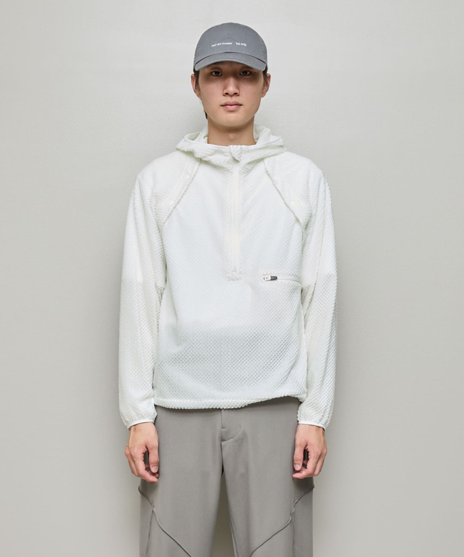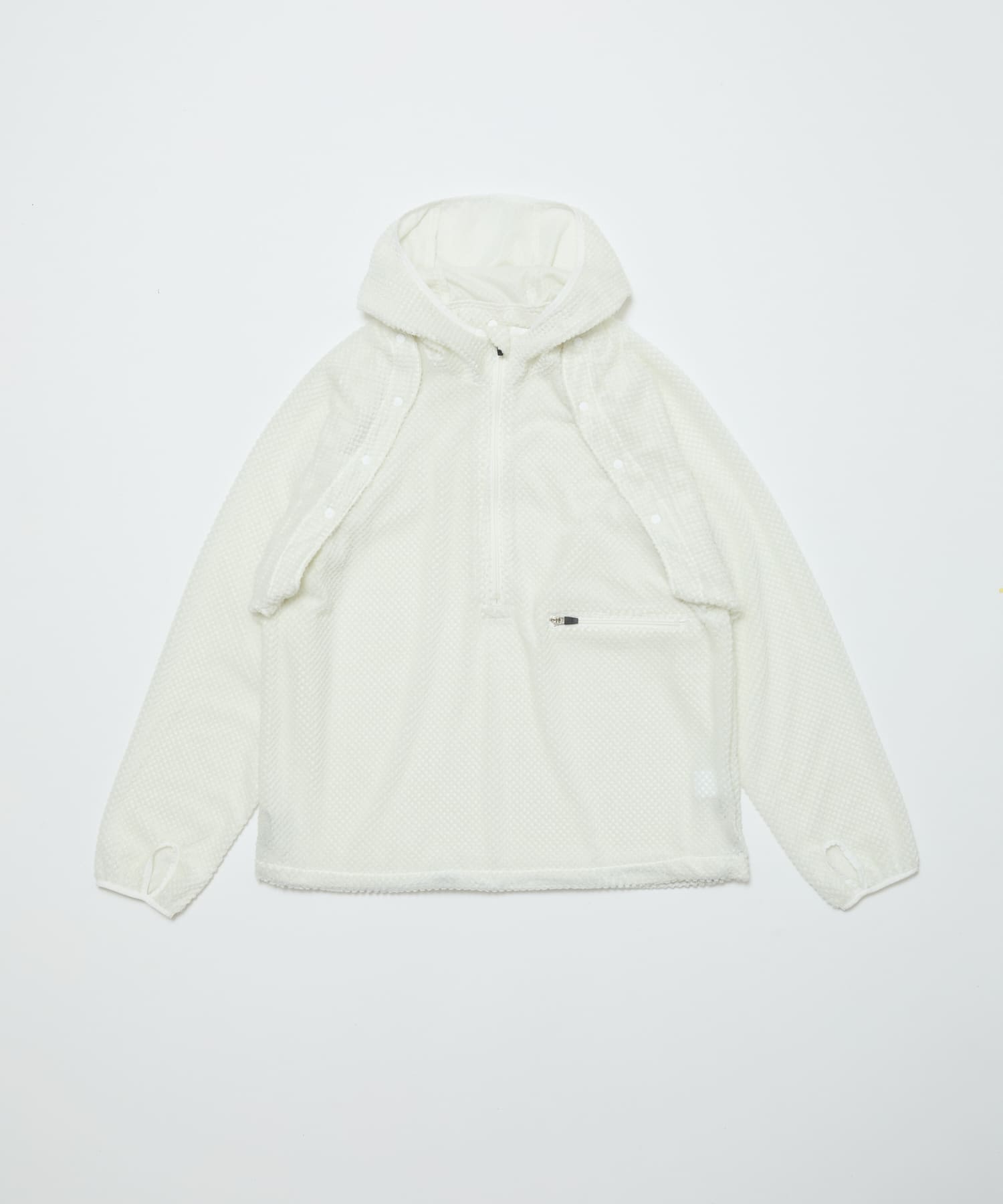 超軽量、保温、高い通気性、速乾機能素材TEIJINのOCTA®︎を使用。取り外し可能な袖を外すとベストになるハーフジッププルオーバーフーディー。