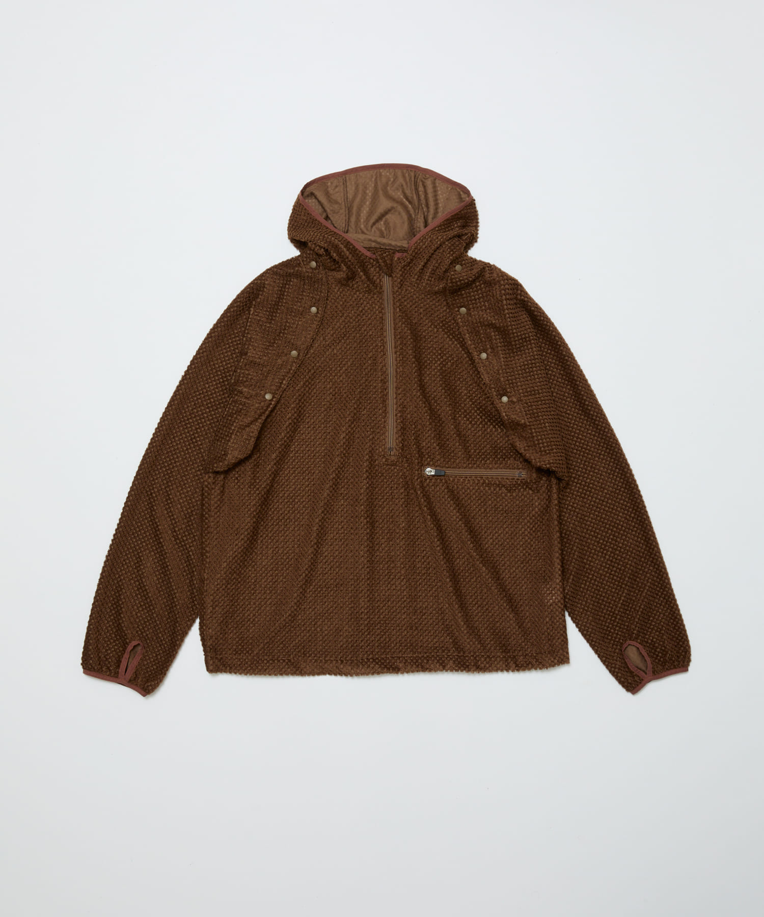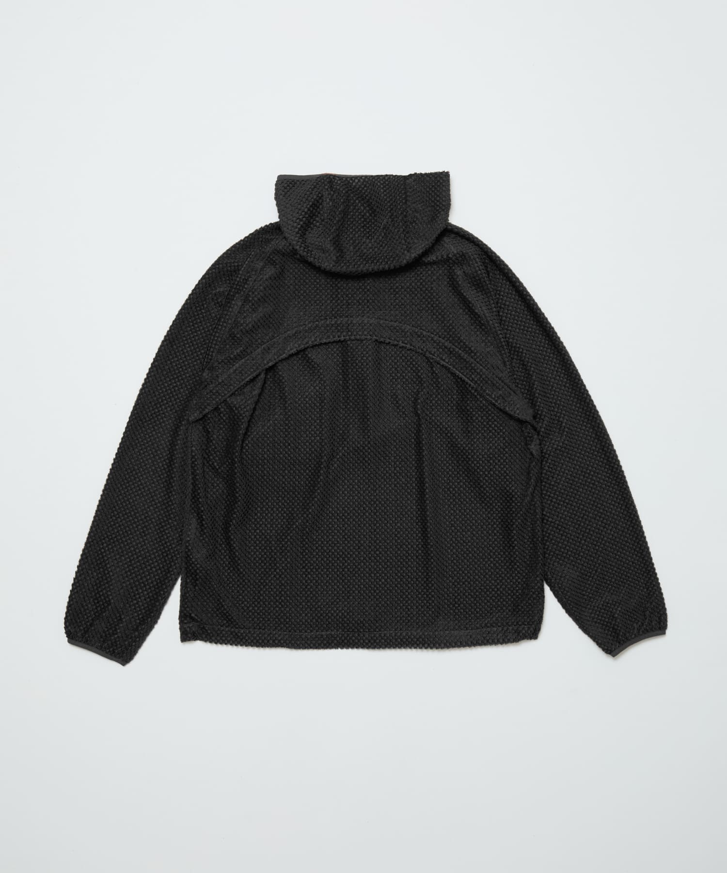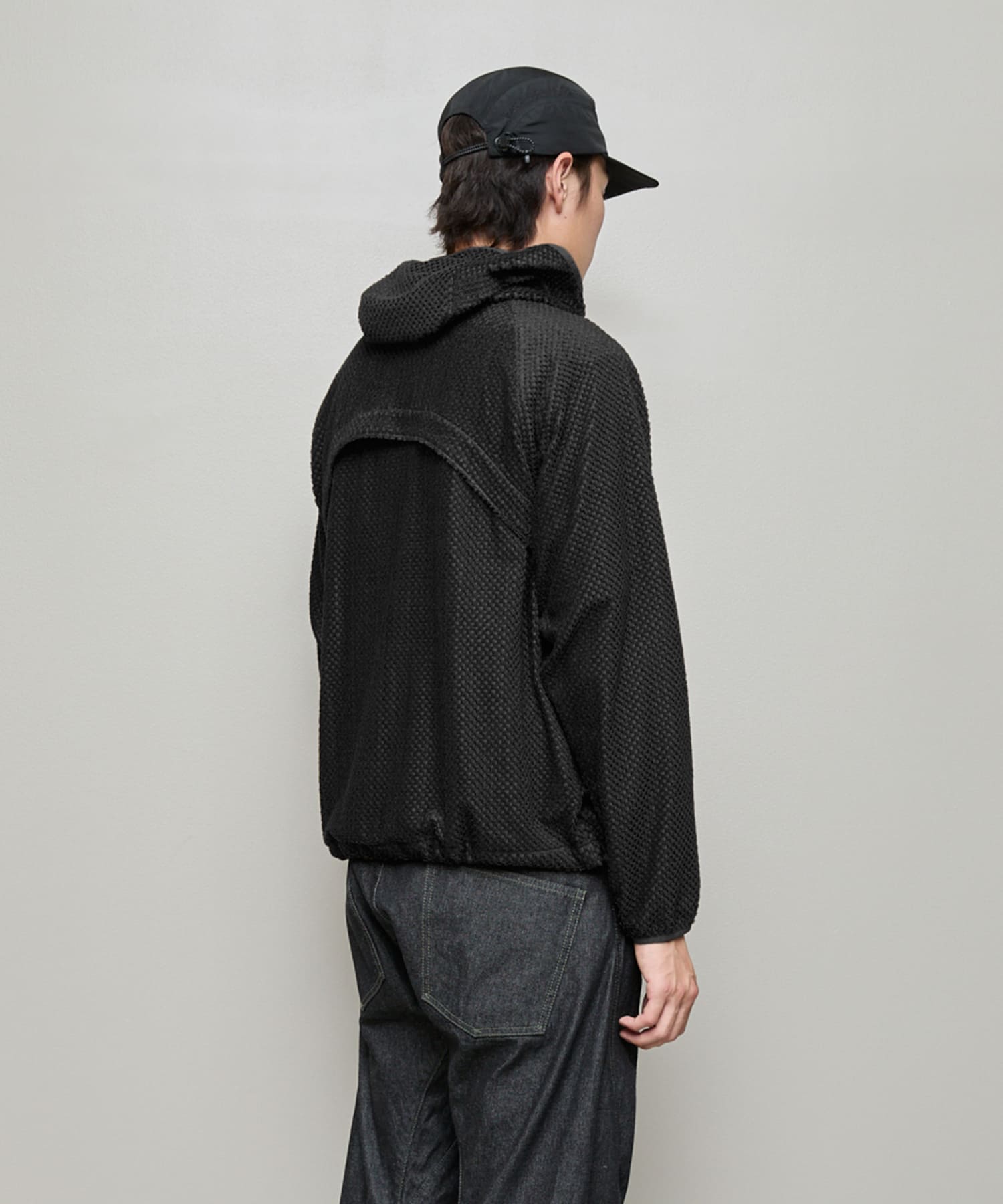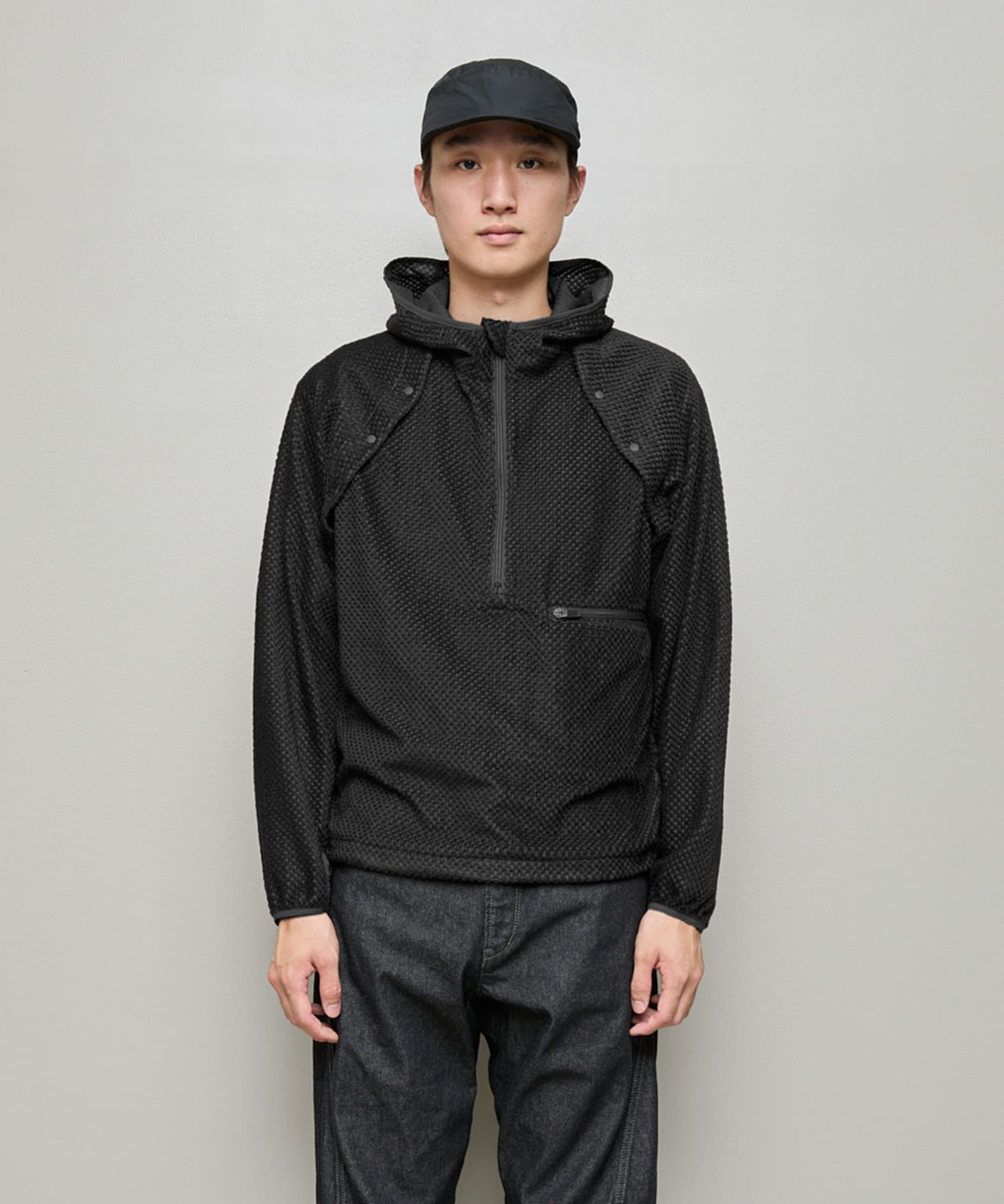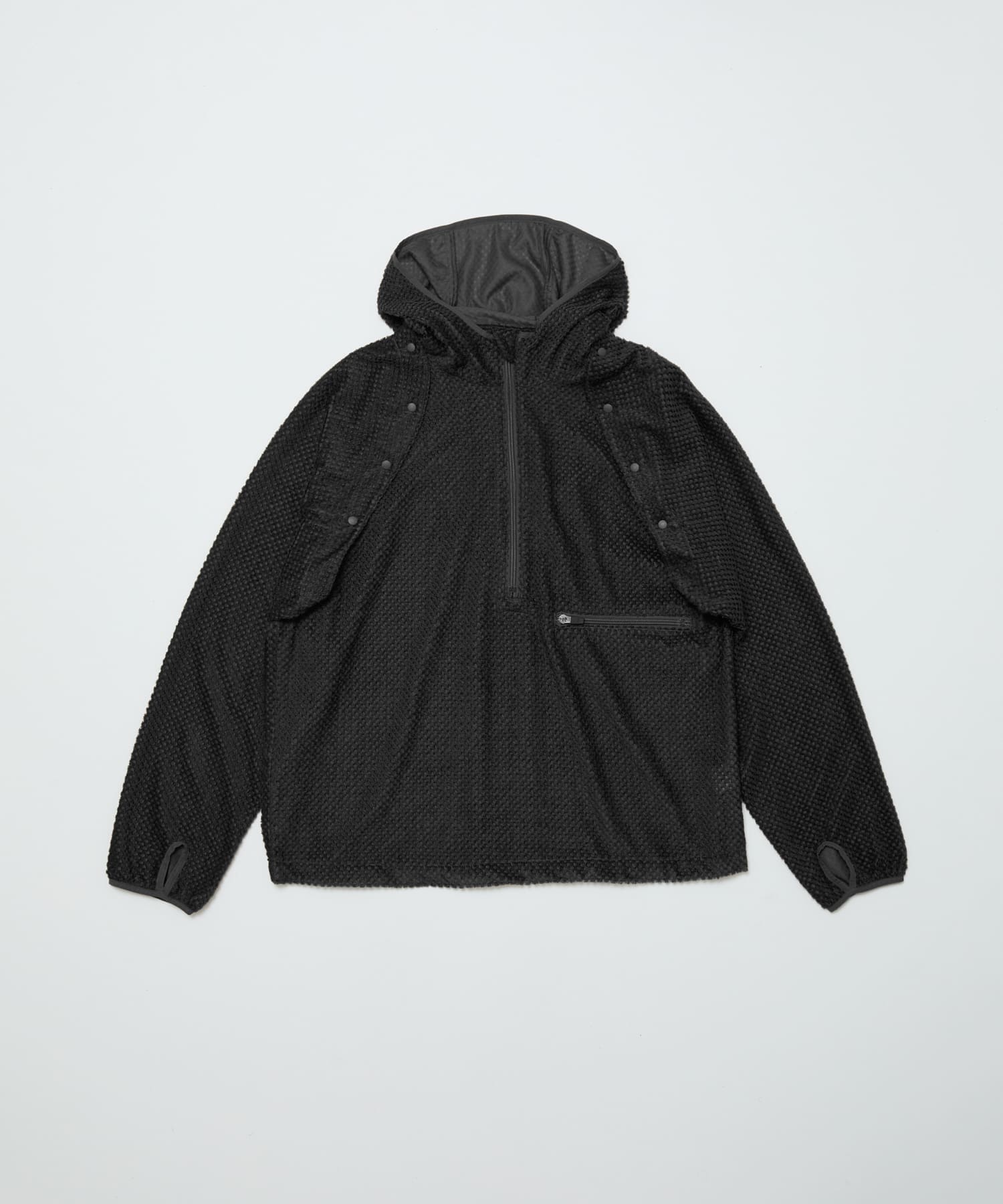 超軽量、保温、高い通気性、速乾機能素材TEIJINのOCTA®︎を使用。取り外し可能な袖を外すとベストになるハーフジッププルオーバーフーディー。