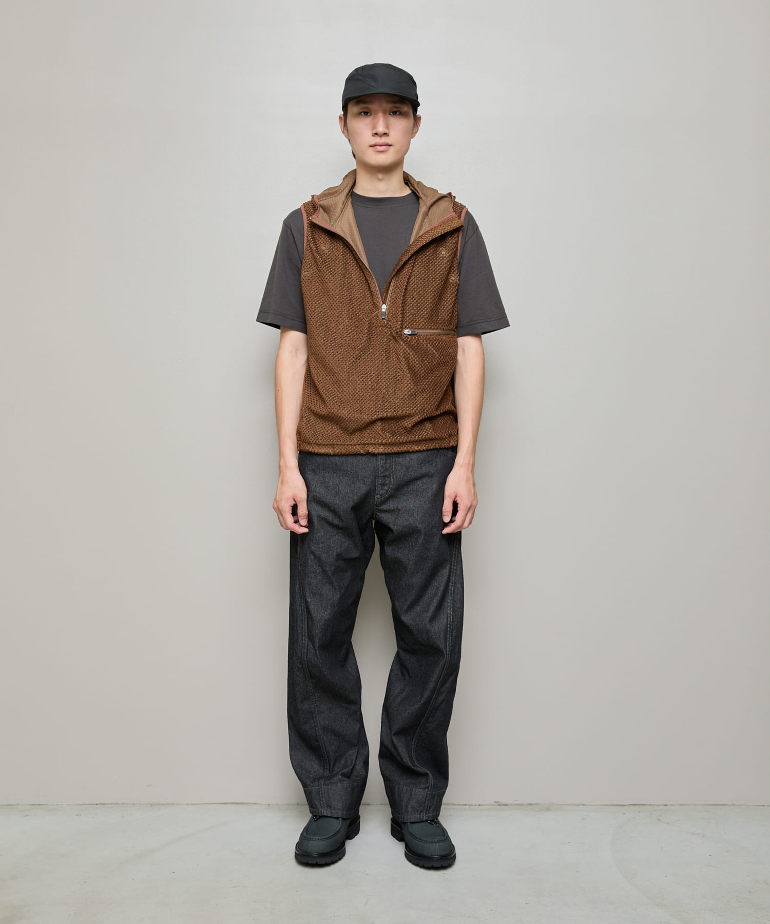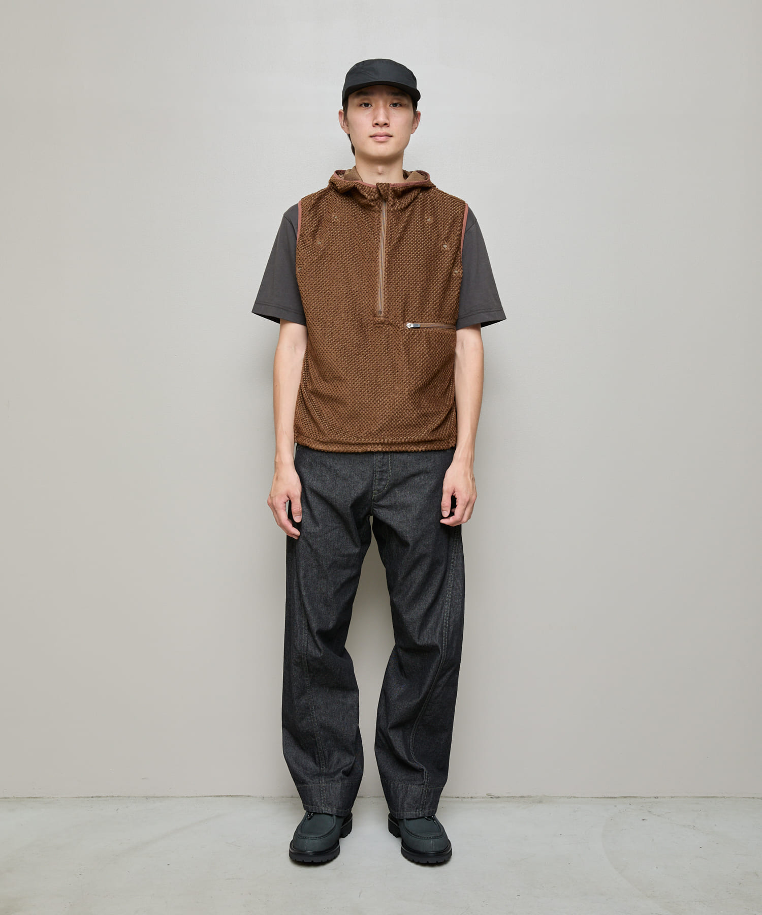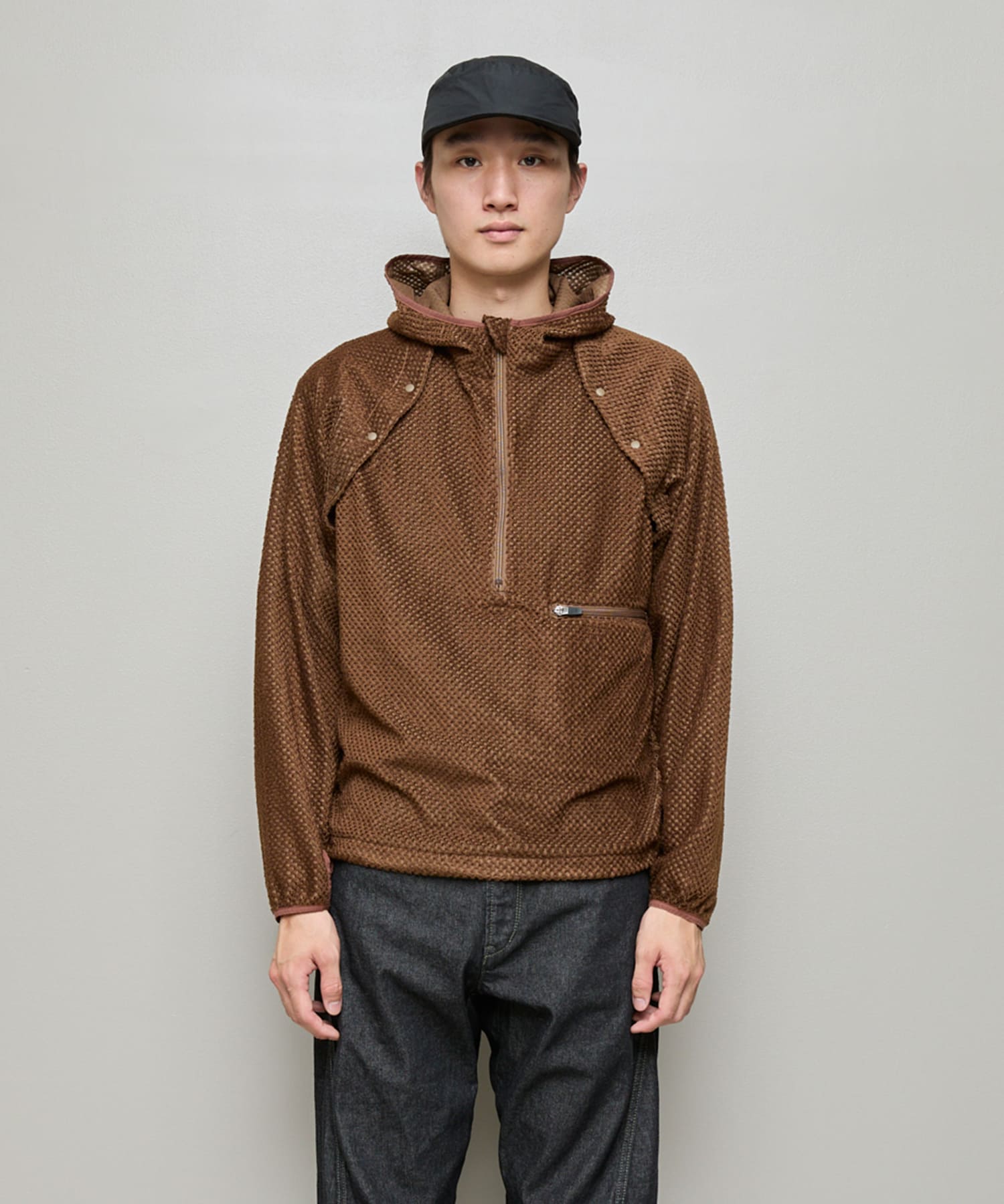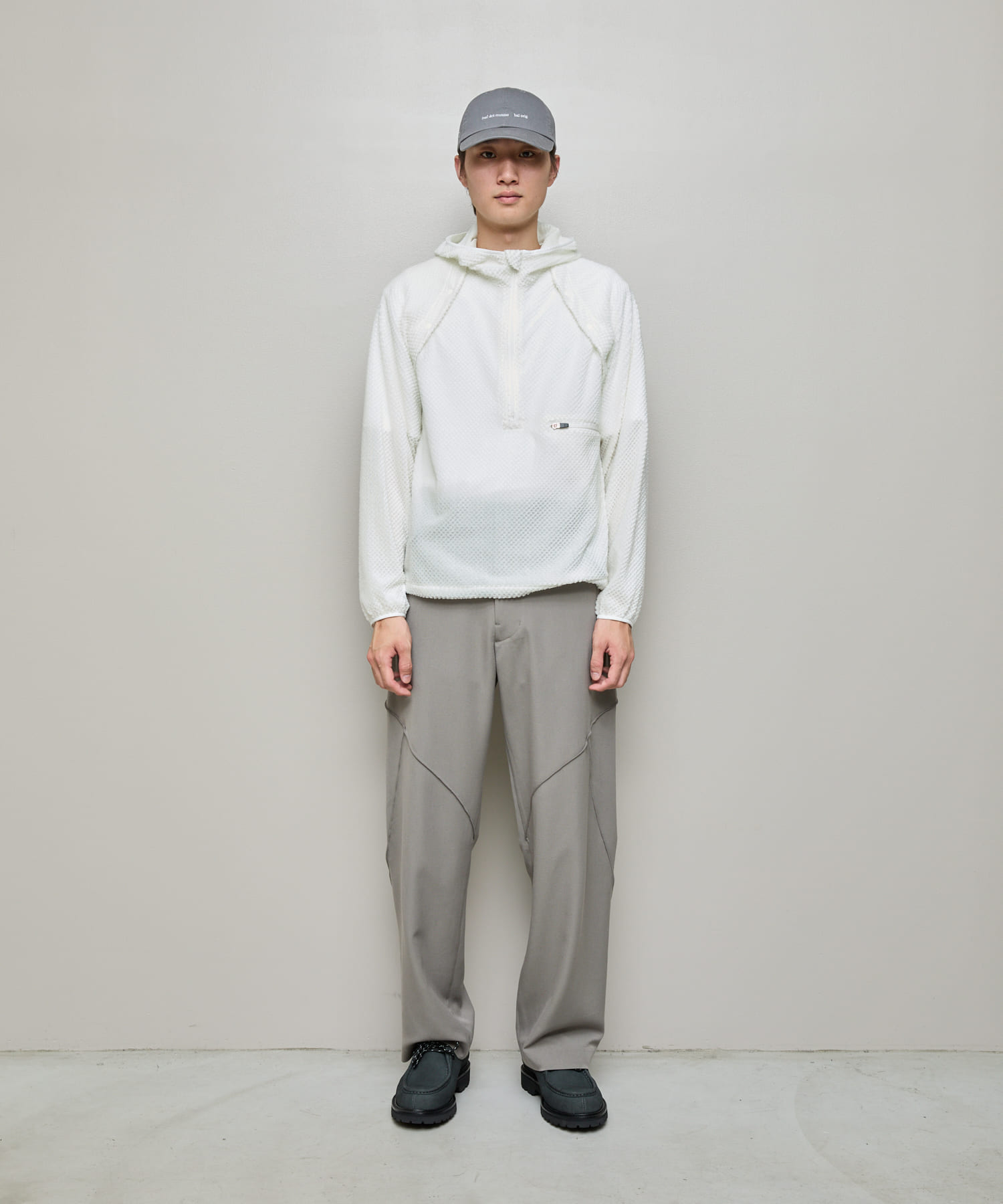 超軽量、保温、高い通気性、速乾機能素材TEIJINのOCTA®︎を使用。取り外し可能な袖を外すとベストになるハーフジッププルオーバーフーディー。