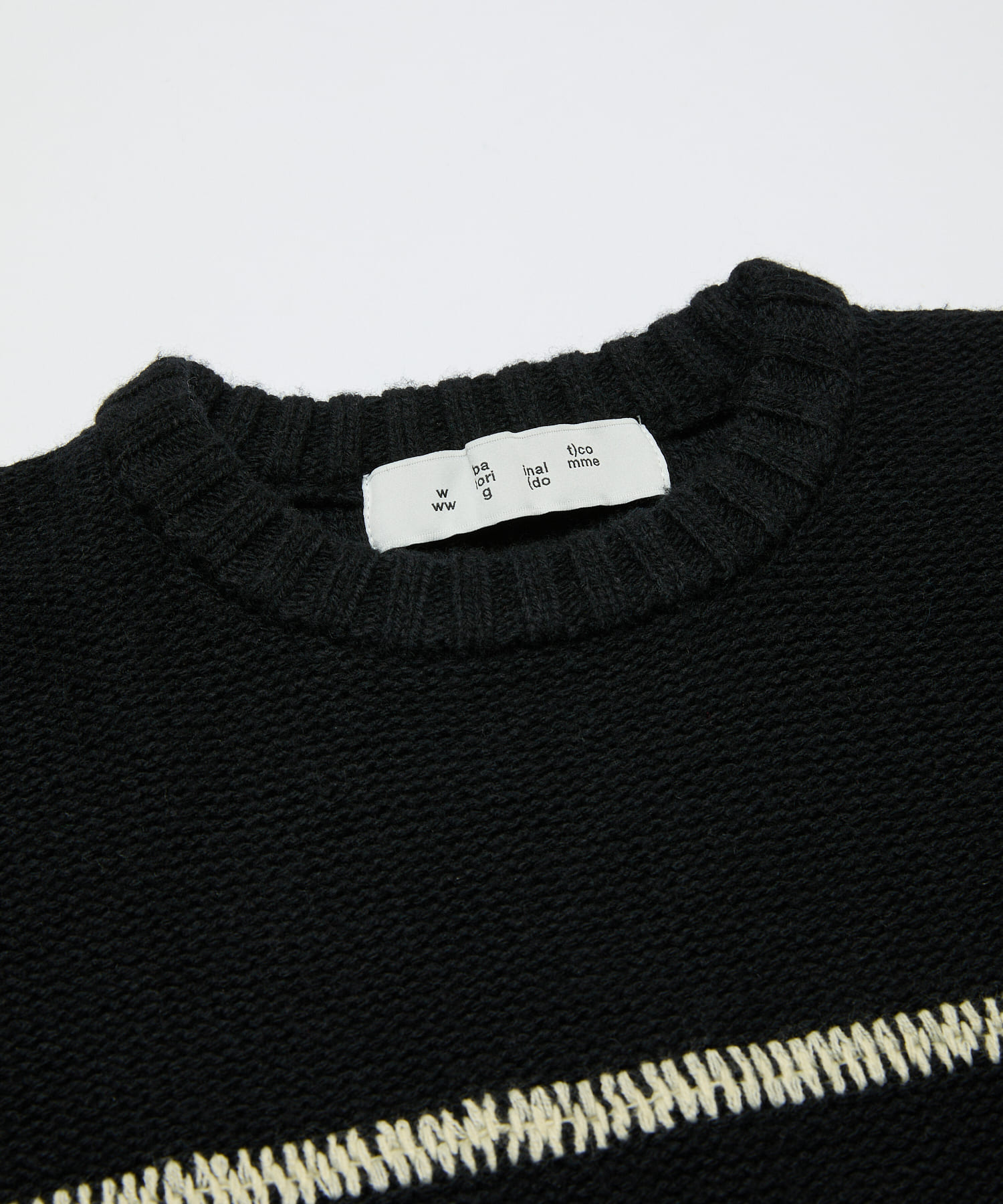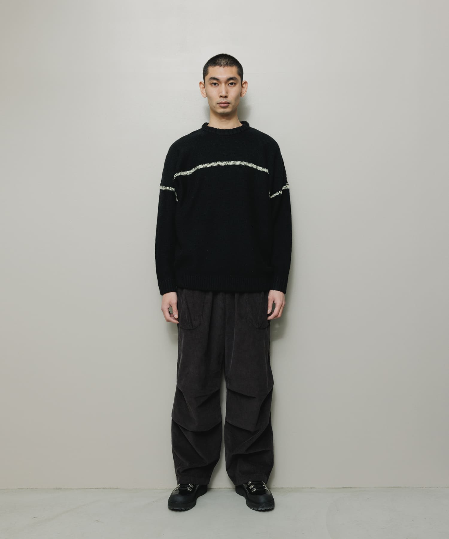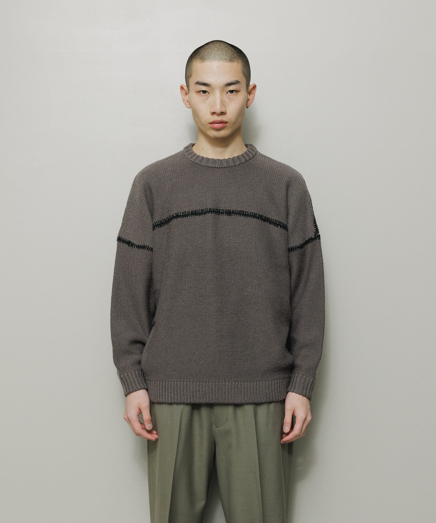 ミドルゲージのドロップショルダーニット。メリノウール、リサイクルのポリエステル、ナイロン、アクリル糸のソフトタッチで膨らみ感のある糸を使用。